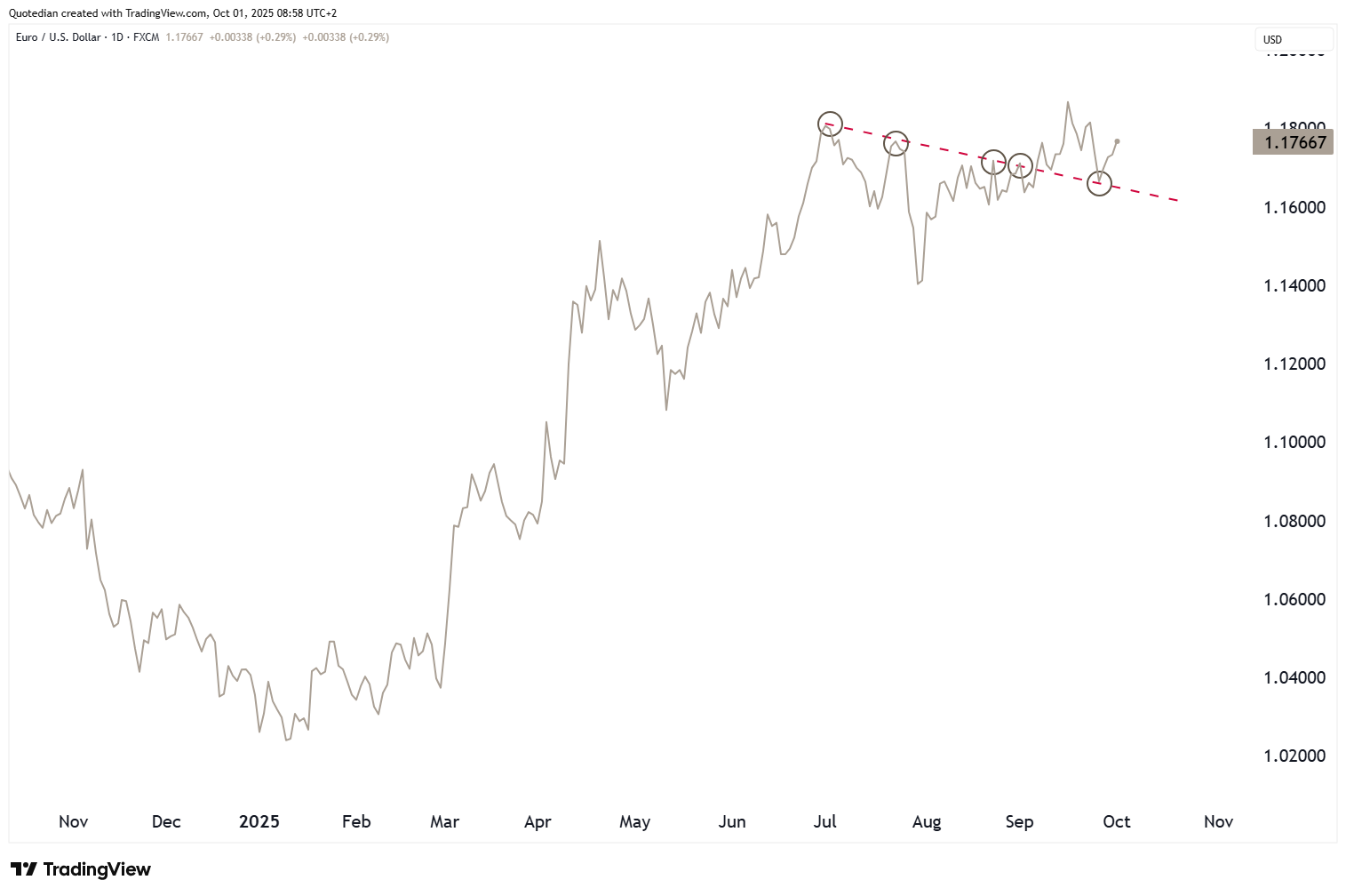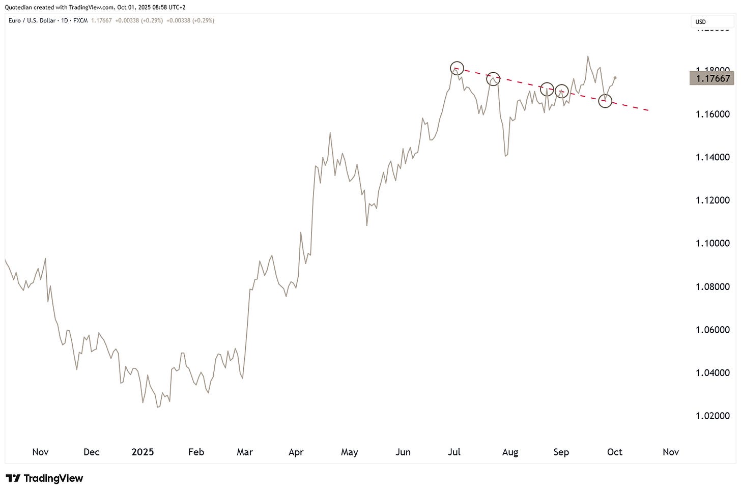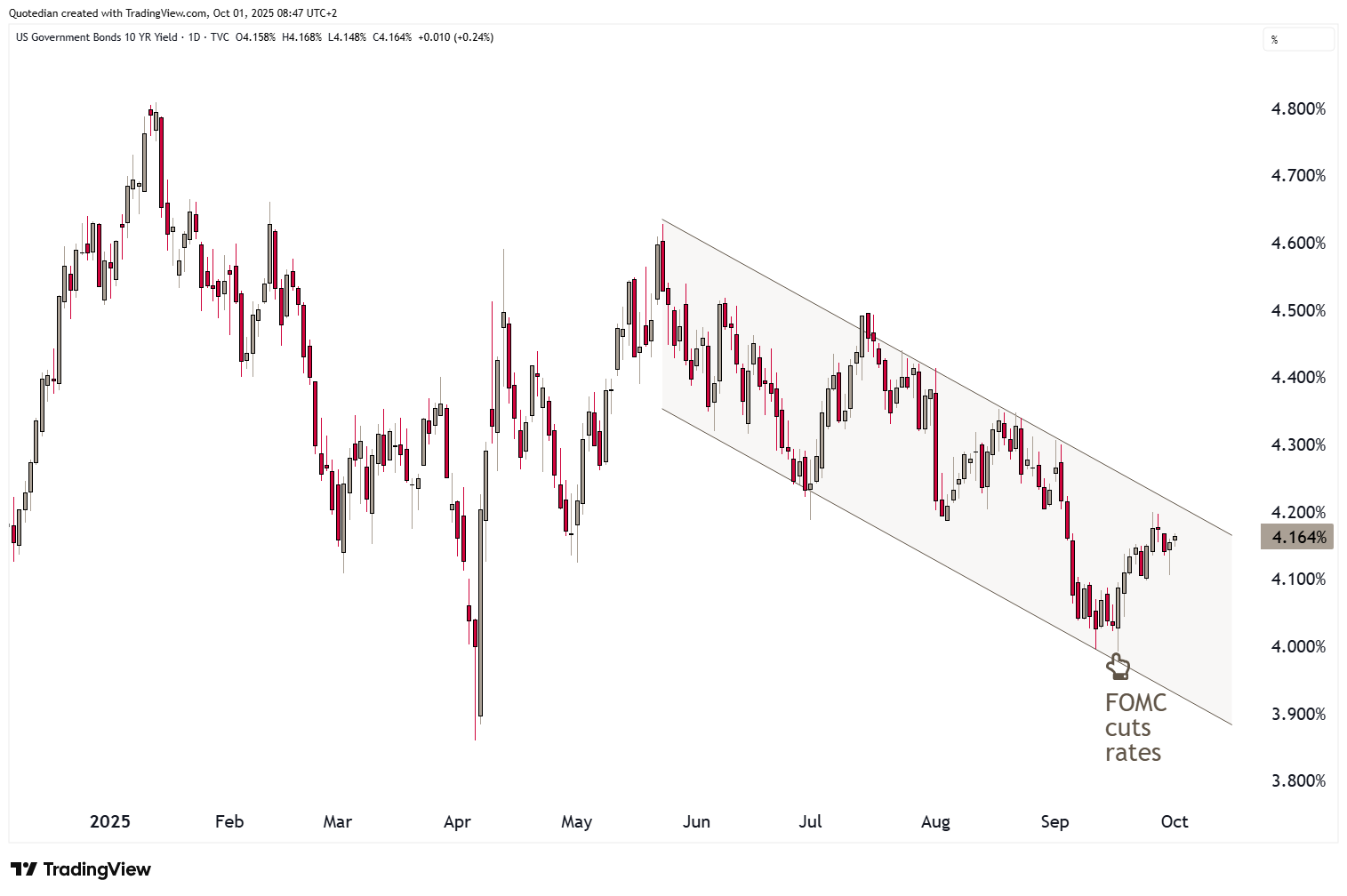 Bond yields, similar as during the last shutdown, have so far reacted fairly unimpressed. Here’s the daily chart of the US 10-year yield: