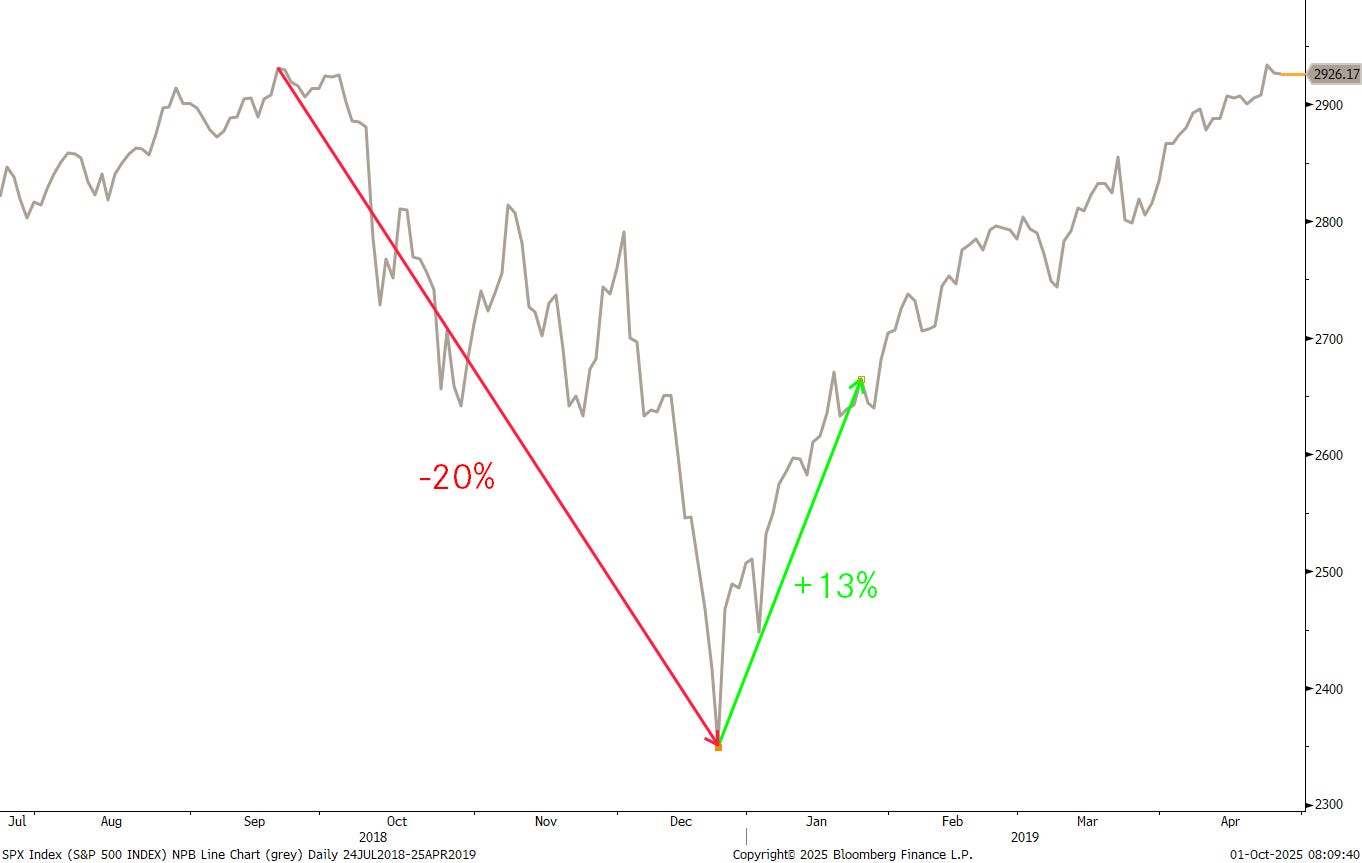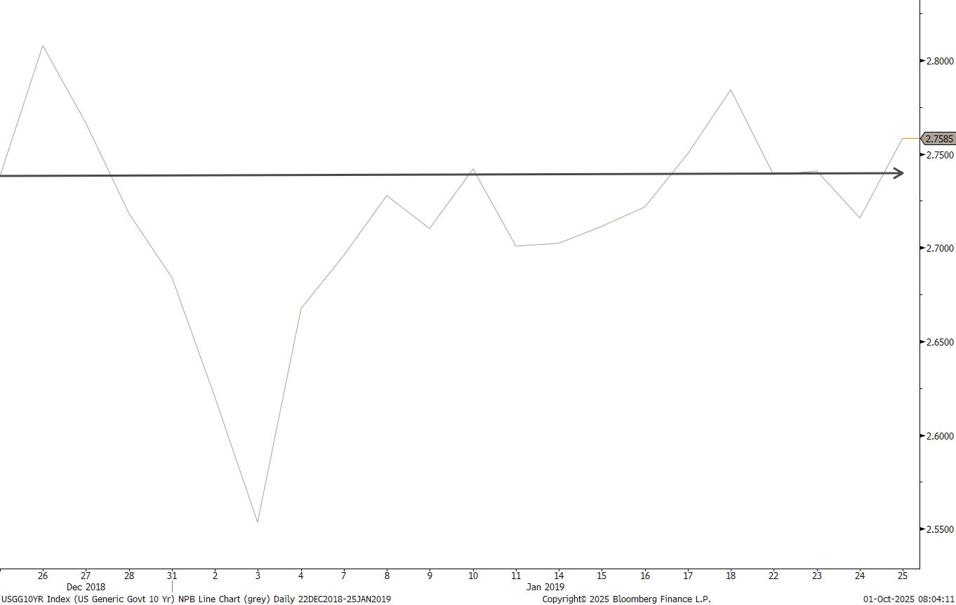 Whilst yields did bugger all, stocks actually climbed 13%. However, we need to put this into the context that the government shutdown coincided precisely with the end of Volmageddon 2.0, as one Fed Chair named Jerome Powell privately reassured Treasury Secretary Steven Mnuchin and markets that the Fed would be “patient” and flexible on rate hikes and the balance sheet. Here’s a zoom-out on the previous S&P 500 chart for context of that period:
