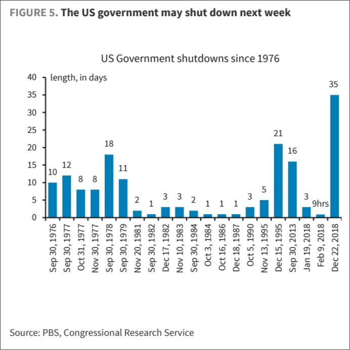As ABBA used to sing: “My, my, here we go again …” and so we have another US government shut down. But hang on! It has actually been seven years since the last one! Though I have checked with my friend Wilson (aka ChatGPT), and there have eleven 11-th hour (coincidence?) avoidances of shut downs since that previous one. And to be precise, the previous one was on December 22, 2018 and lasted until January 25, 2019 - same full 35 days and hence making it the largest shutdown in US history. FWIW, here is a chart from Barclays showing the length of previous shutdown periods: