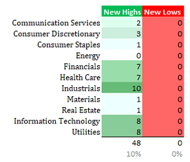 Breadth for the session was pretty decently tilted towards the positive side, with three stocks up for every decliner (S&P 500) and no new 52-week lows in comparison to 48 index constituents hitting a new 52-week high. That does not seem too bearish. The new highs were widely spread amongst industrials, utilities, tech stocks, financials and healthcare: