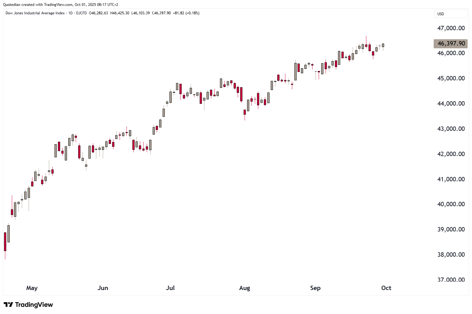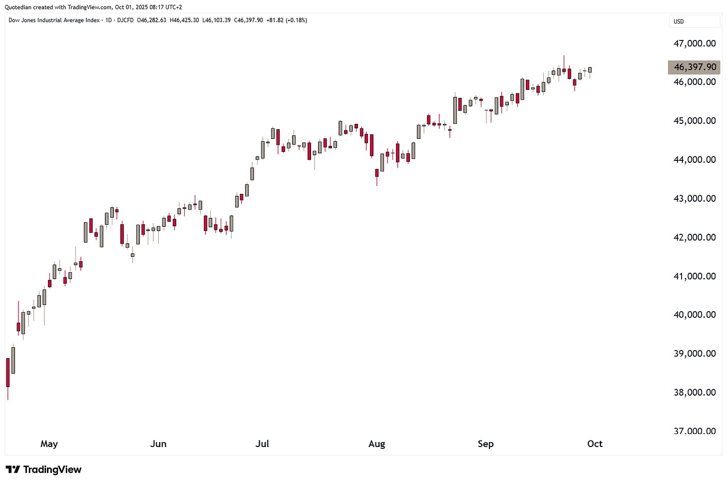 Anyway, yesterday, pre-shutdown US (and European) markets closed higher, in the case of the Dow Jones Industrial high enough to mark yet another new all-time high:
