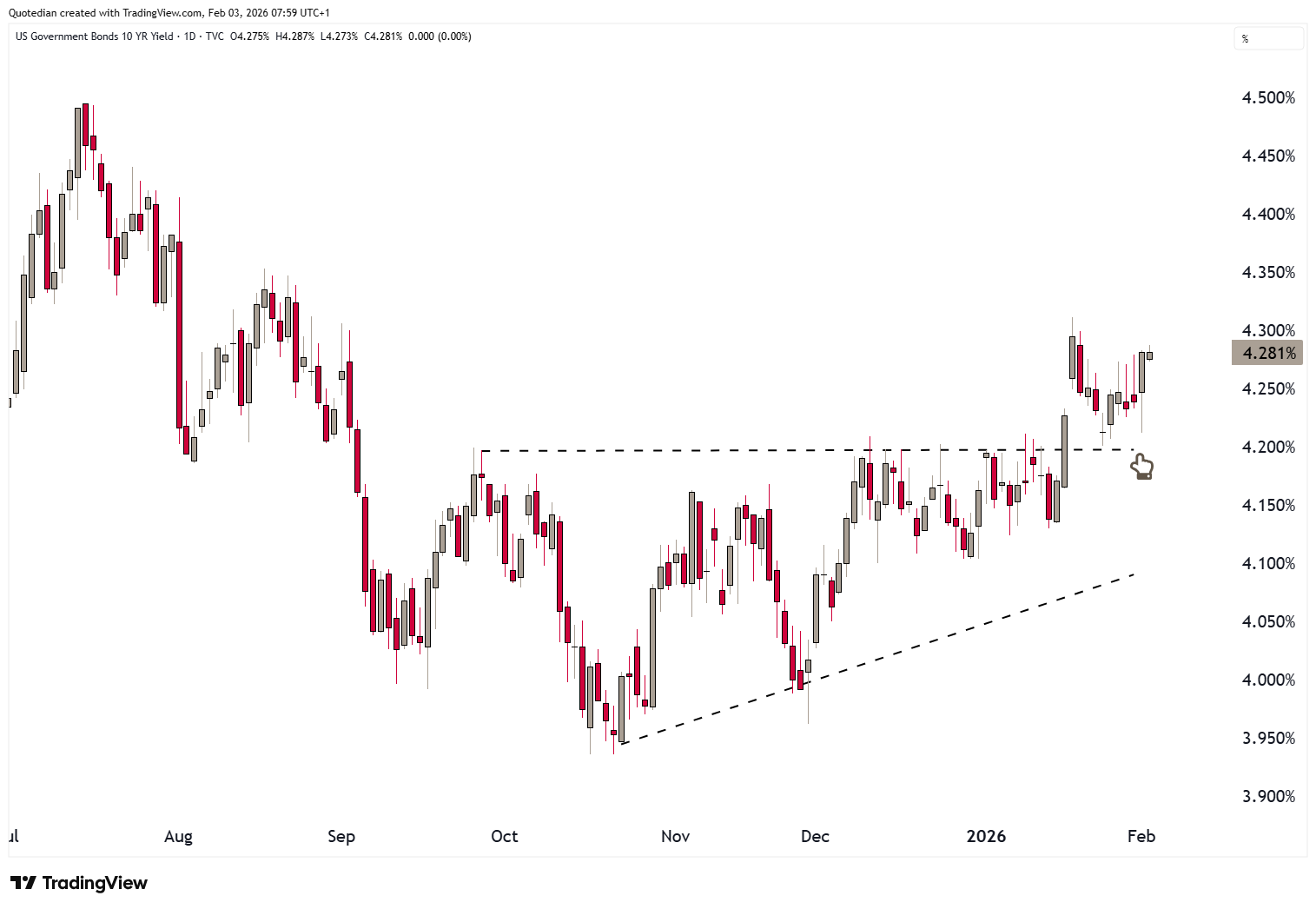 These ‘surprise’ readings were then probably also responsible, with the permission of Fed Chair nominee Warsh, for US bond yields to press higher yesterday, rebounding from what previously resistance (dashed line), now turned support: