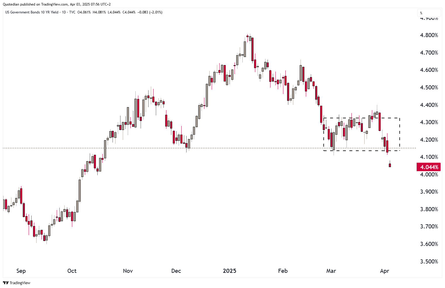 Global bond yields are massively lower, with the Tens at 4.04% right now having been catapulted out of its trading range and well below any reasonable support: