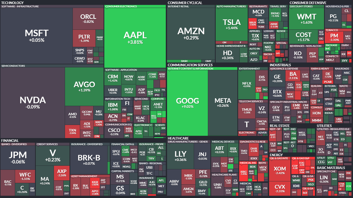 The ratio between advancing and declining stocks was roughly equal, maybe with a slight slant to the latter, which in turn means that the heavy-swingers in the index probably did well: