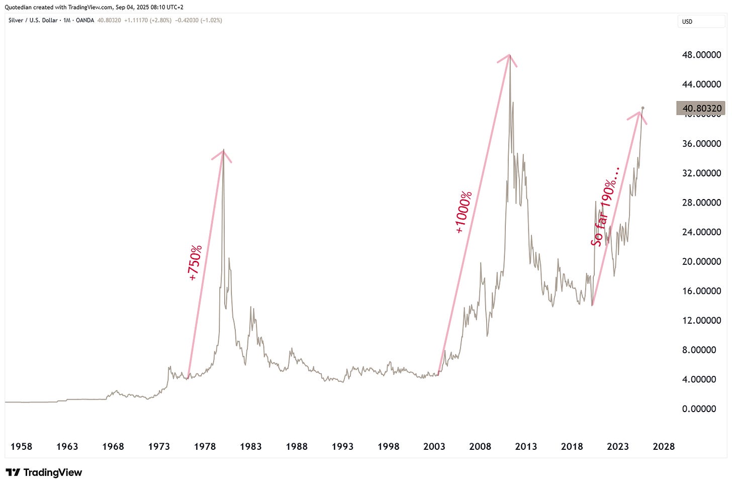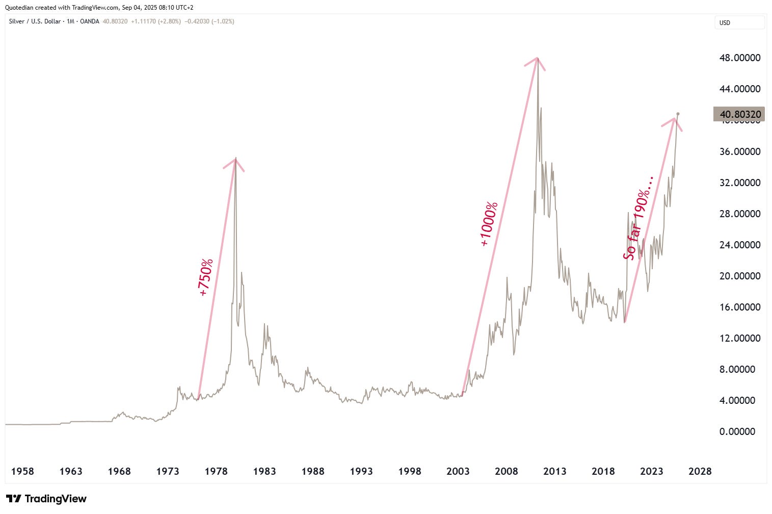 Similarly, Silver has broken above key resistance too, and we ask ourselves if the blow-off tops can from 1980 (Hunt Brothers) and 2011 (EU Sovereign Debt crisis) can be repeated: