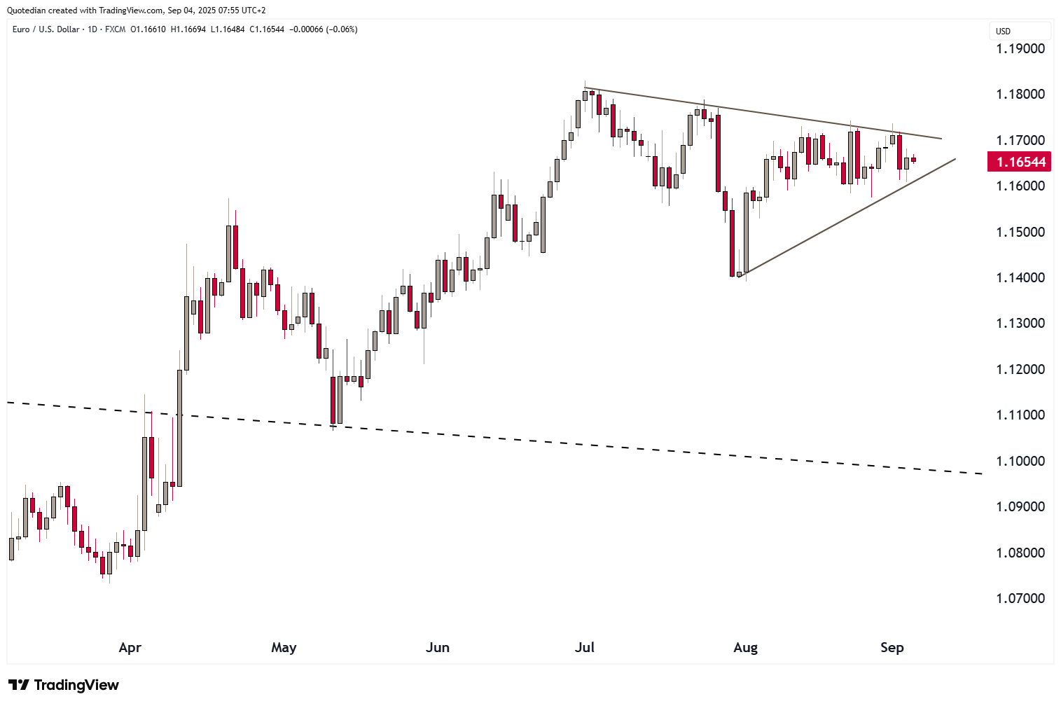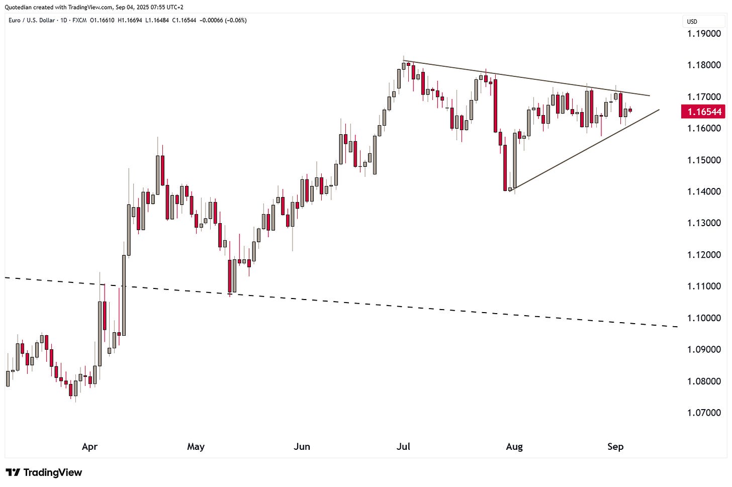 Not much to report back from (fiat) currency markets, where the Dollar continues to consolidate losses from earlier this year. Looking at the EUR/USD chart and the triangle forming, it does however feel that the fall in Greenback is rather a pause, than an inflection point for a reversal: