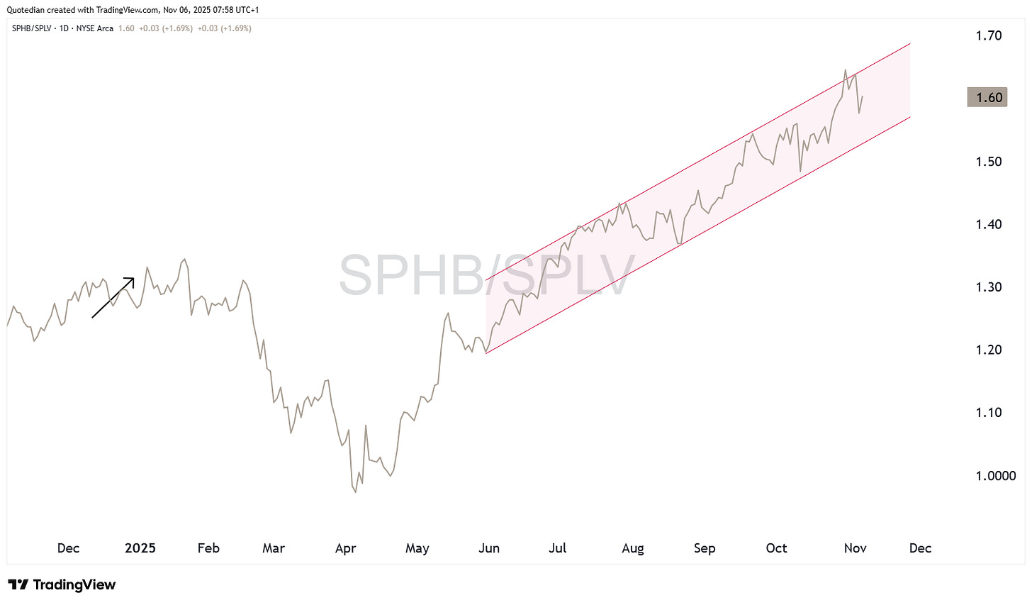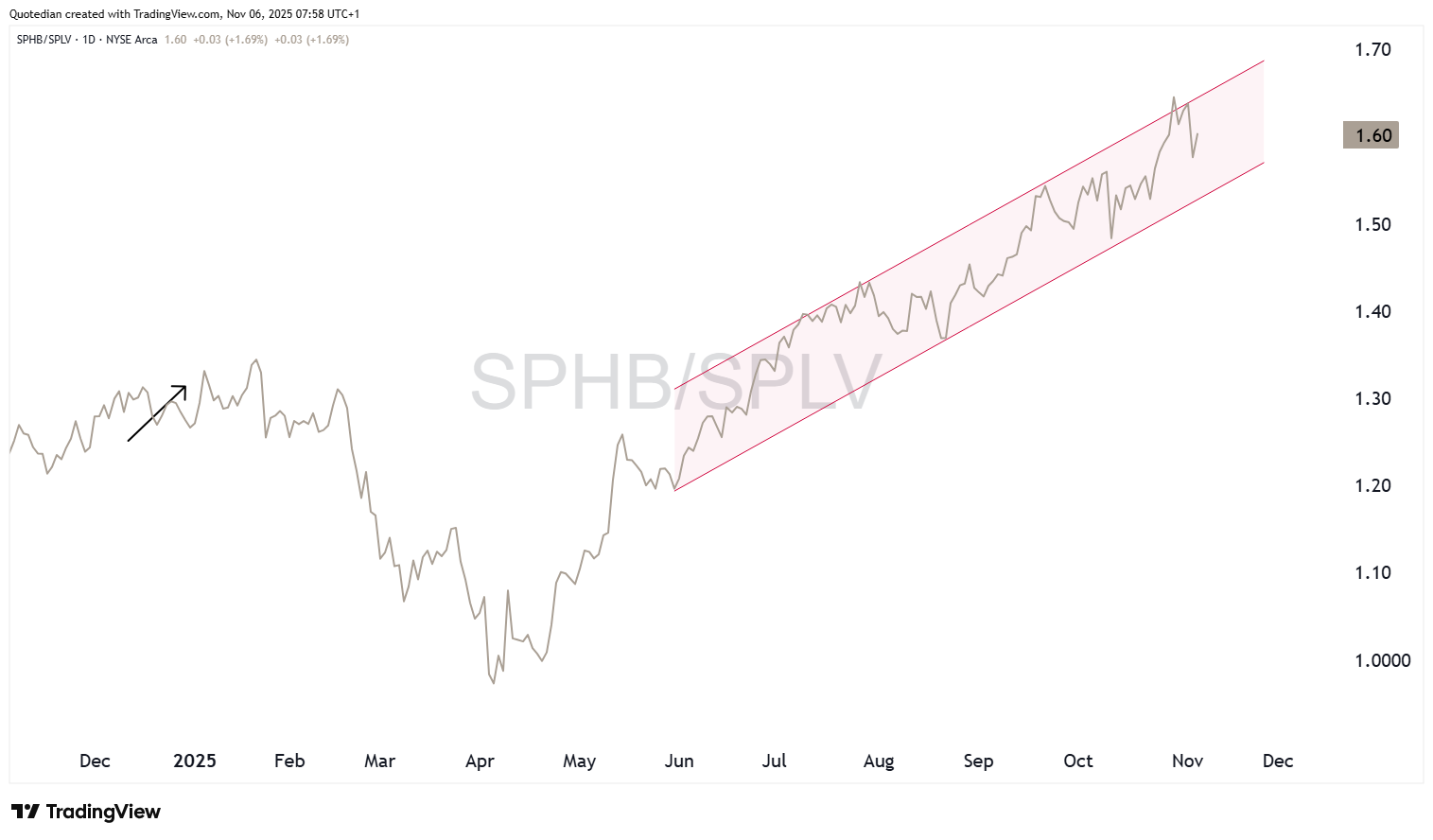 However, the correction should be short-lived, as long as the mode remains risk-on, as measured by the high-beta to low-vola ratio (see below) continuing to move within its uptrend channel (red):