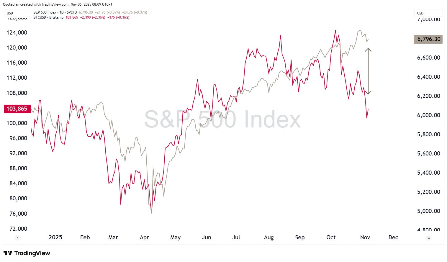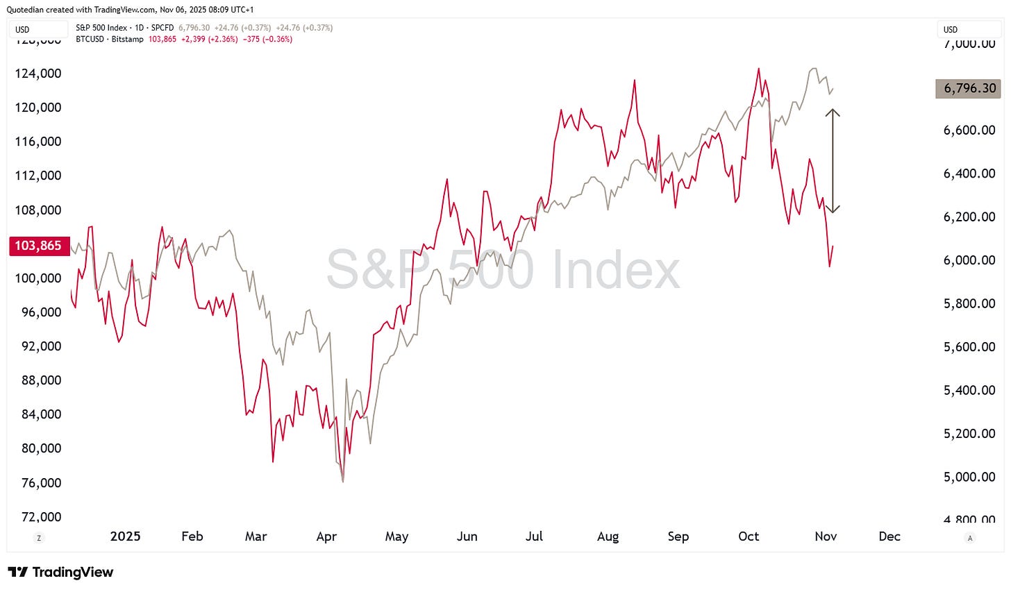 And the other risk-on/risk-off measure to watch (for a possible switch to risk-off) is the divergence between the stock market (grey) and Bitcoin (red), the latter being a potential canary in the coal mine due to its liquidity function: