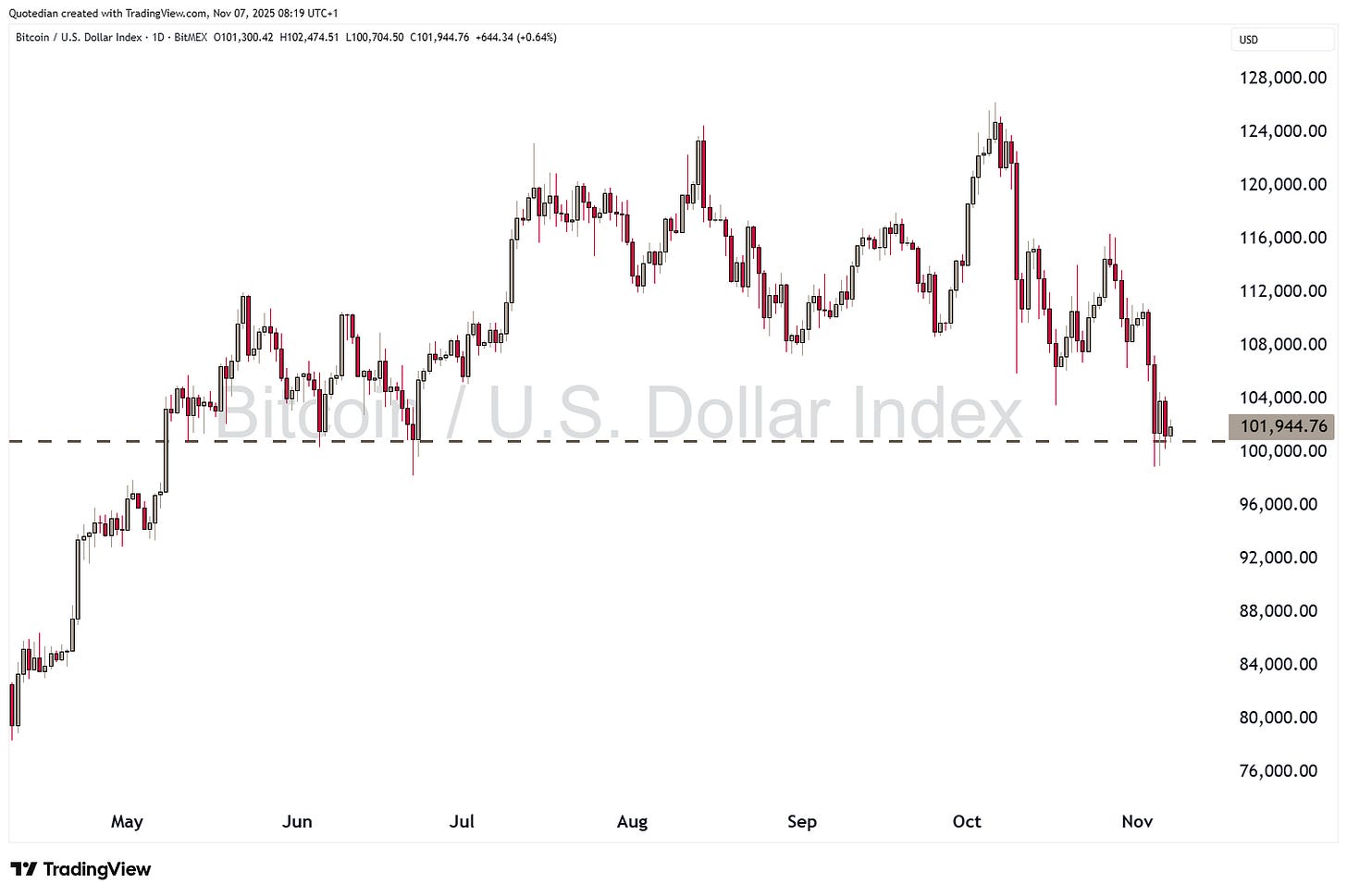 Bitcoin investors must be biting their fingernails, as the 100k support line is being challenged:
