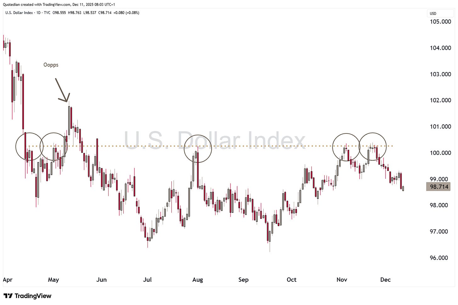 And finally, the USD started debasing softening again. Here’s the US Dollar index (DXY):