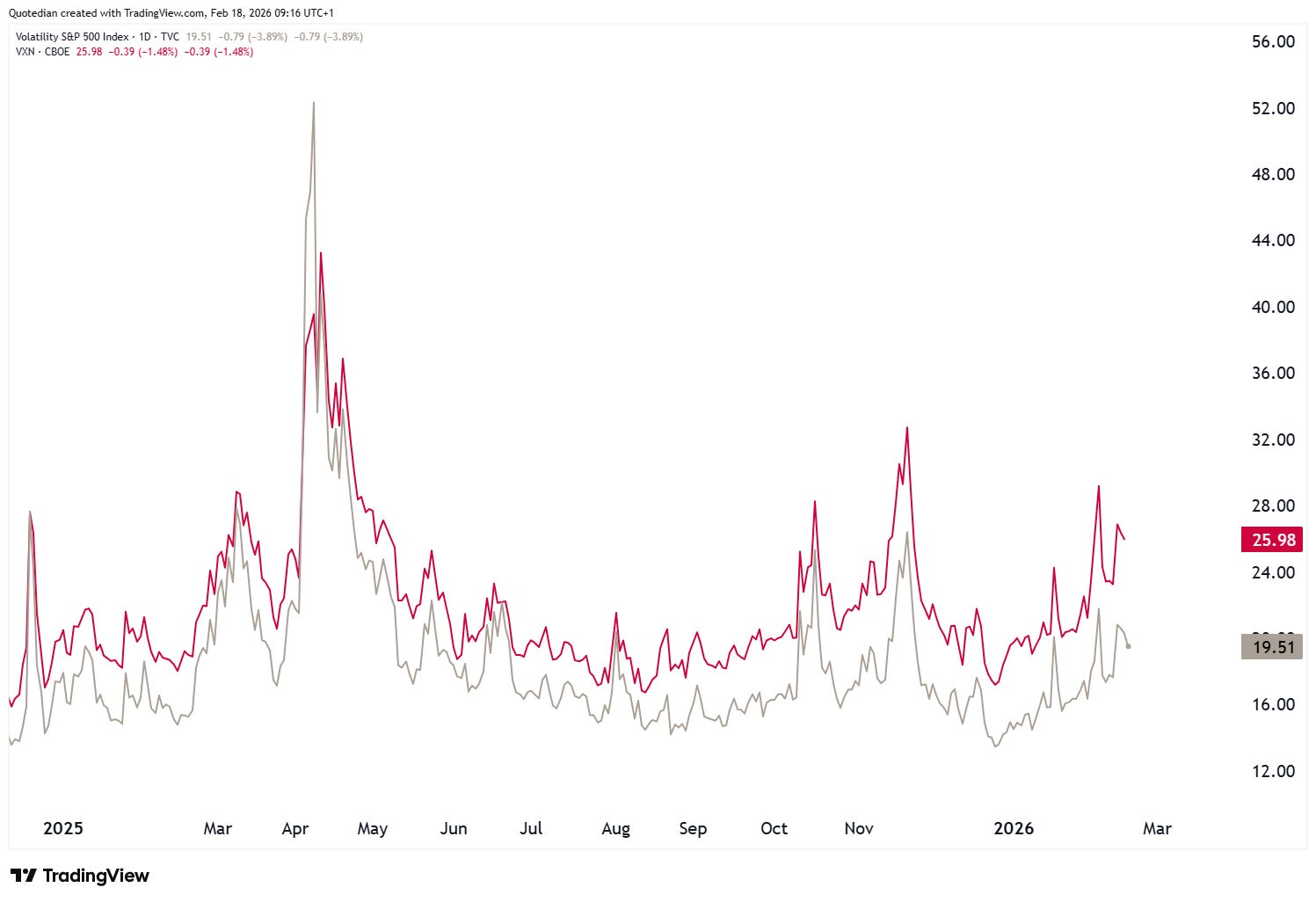 It is then interesting to observe that volatility for the S&P 500 (VIX) and the Nasdaq (VXN) have been moving higher,