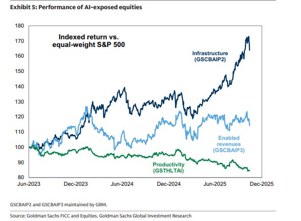 Goldman’s David Kostin drew up three baskets of AI-related stocks: those building infrastructure (data centres), those standing to gain revenue from AI applications, and those with productivity problems that stand to benefit most from it.