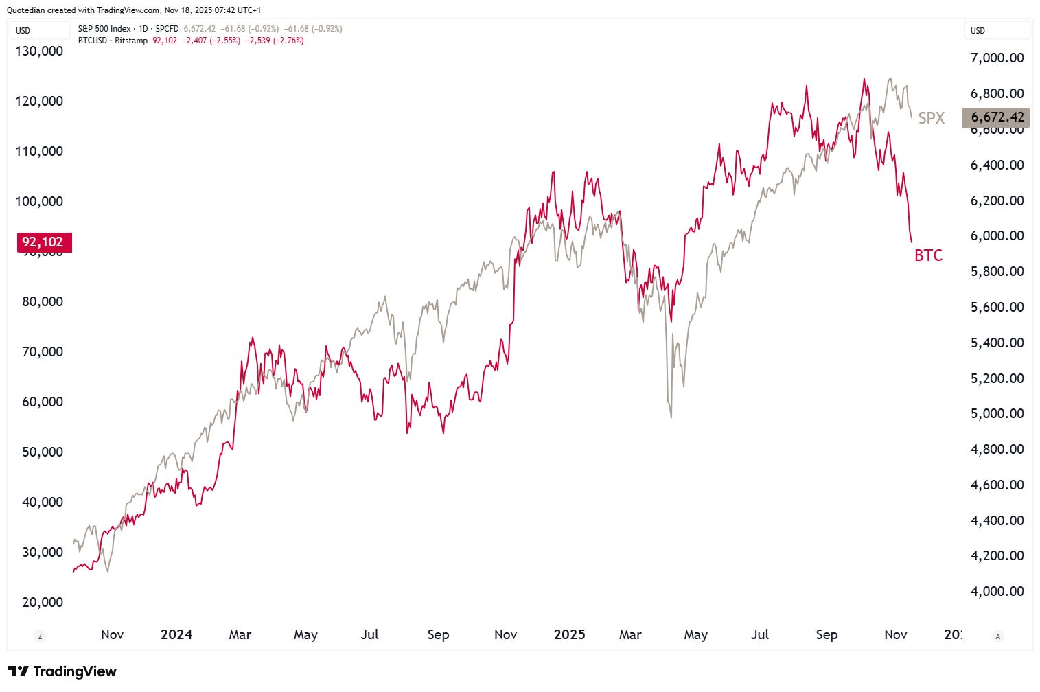 One additional concern we have been observing recently, has been the divergence between Bitcoin, a global risk on/off indicator, and stock prices: