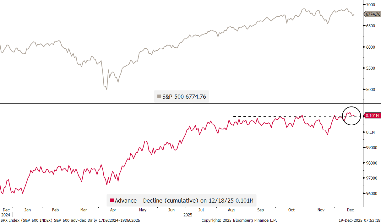 But then again, looking at market internals, breadth has been holding up when looking at the cumulative advance-decline ratio for the S&P 500: