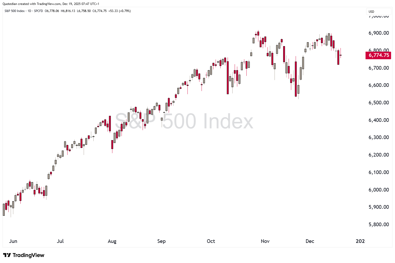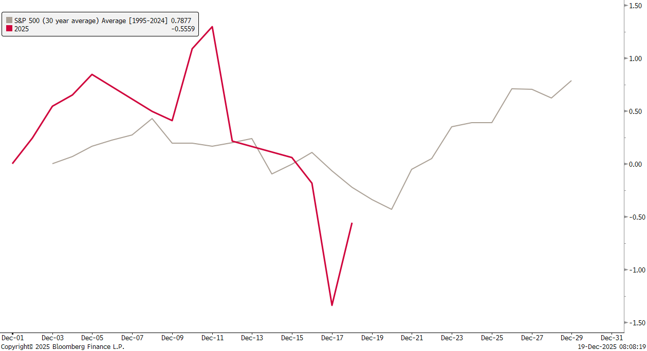 One last point, which goes in favour of the Grinch, is the weakness of cryptocurrencies, where the bellwether Bitcoin is strongly diverging from (tech) stocks: