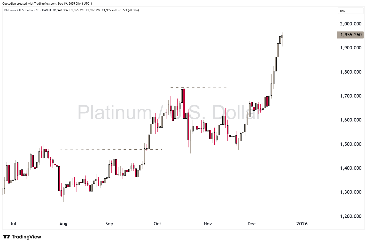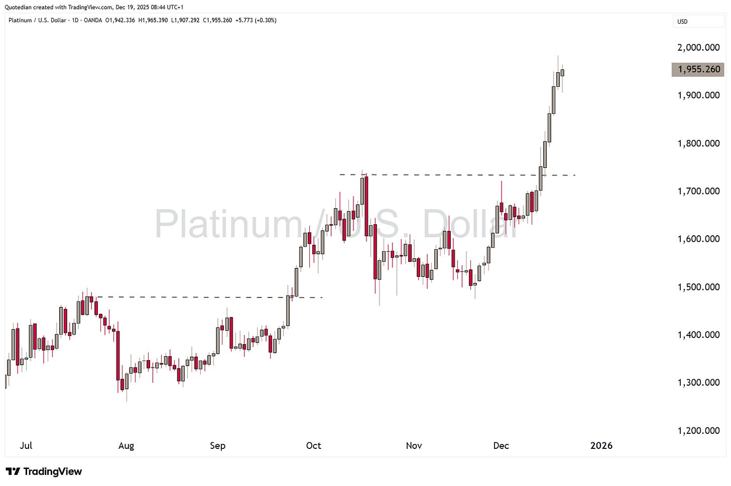 Joining the party recently has been Platinum, not least thanks to a EU decision relating to the future of automobiles, as discussed in the QuiCQ two days ago: