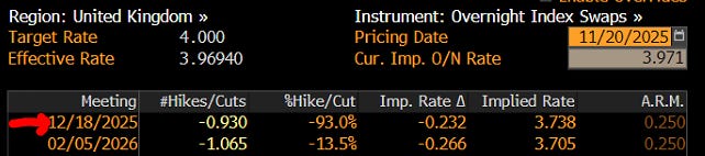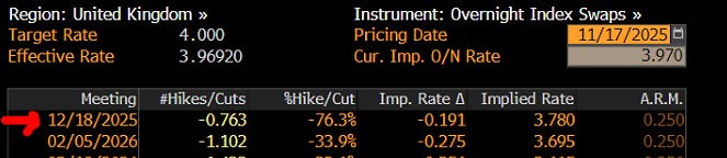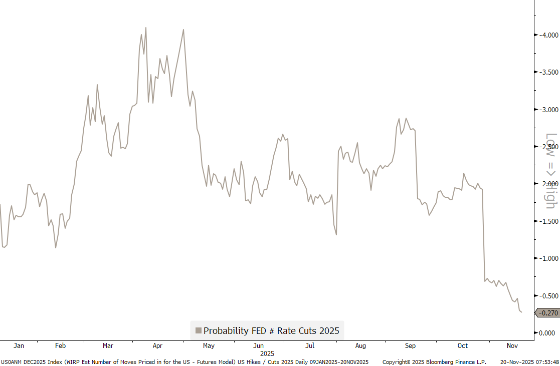 As a result the odds implied by futures market for a December rate cut have now dwindled further from Monday’s 40% to less than 30%: