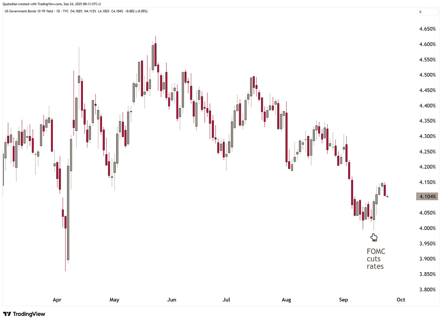Bonds were bid around the globe yesterday, but the truth is, that since the Fed cut last week, the uptrend in YIELDS has reignited. Here’s the US 10-year treasury as proxy for the rest:
