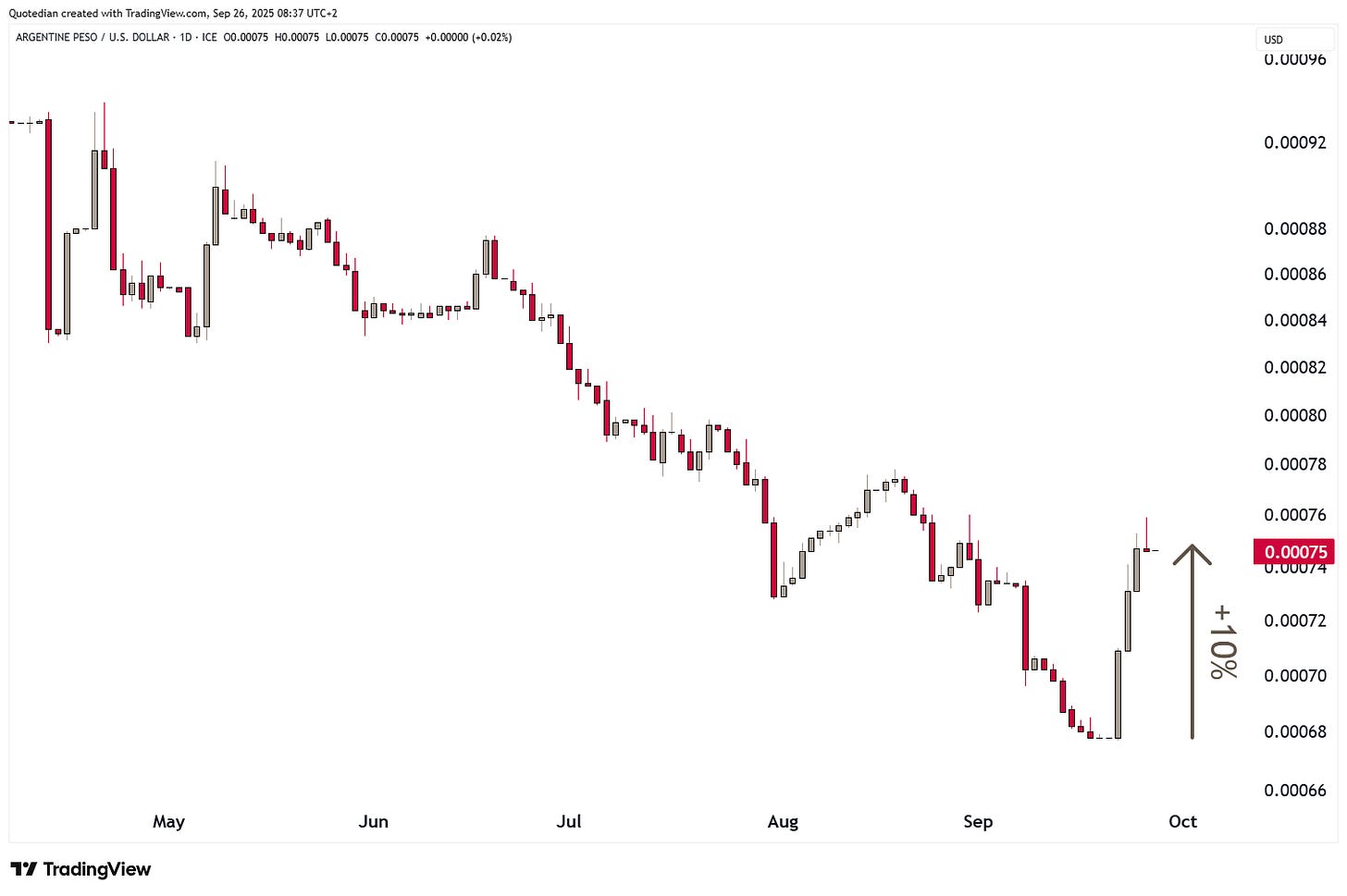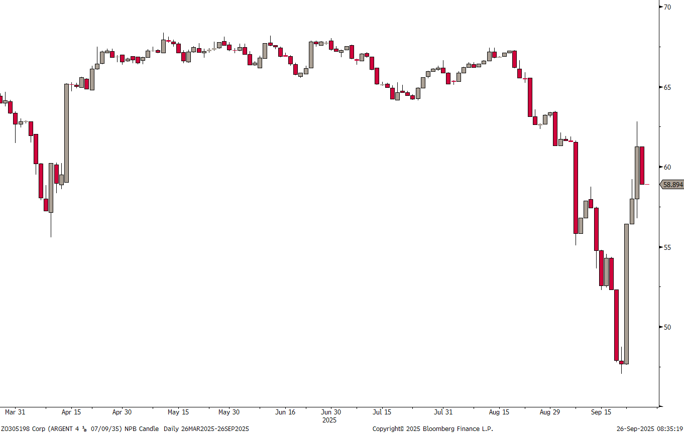 The Argentina bond market has found some relief, as Javier Milei is negotiating new pocket money in the form of a USD20 billion swap line with Uncle Scott. Here’s the price action on the current 10-year Argentina benchmark bond: