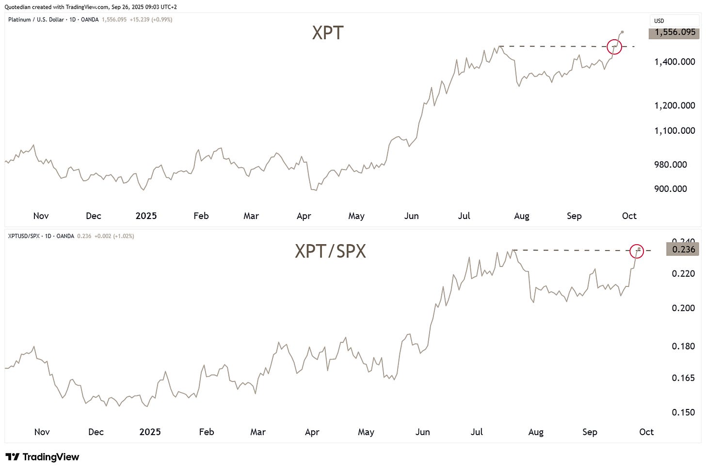 On an absolute basis (upper clip), XPT has already broken out above previous cycle highs, on a relative basis to stocks (lower clip) it is about to do so, which would be a strong trend confirmation signal: