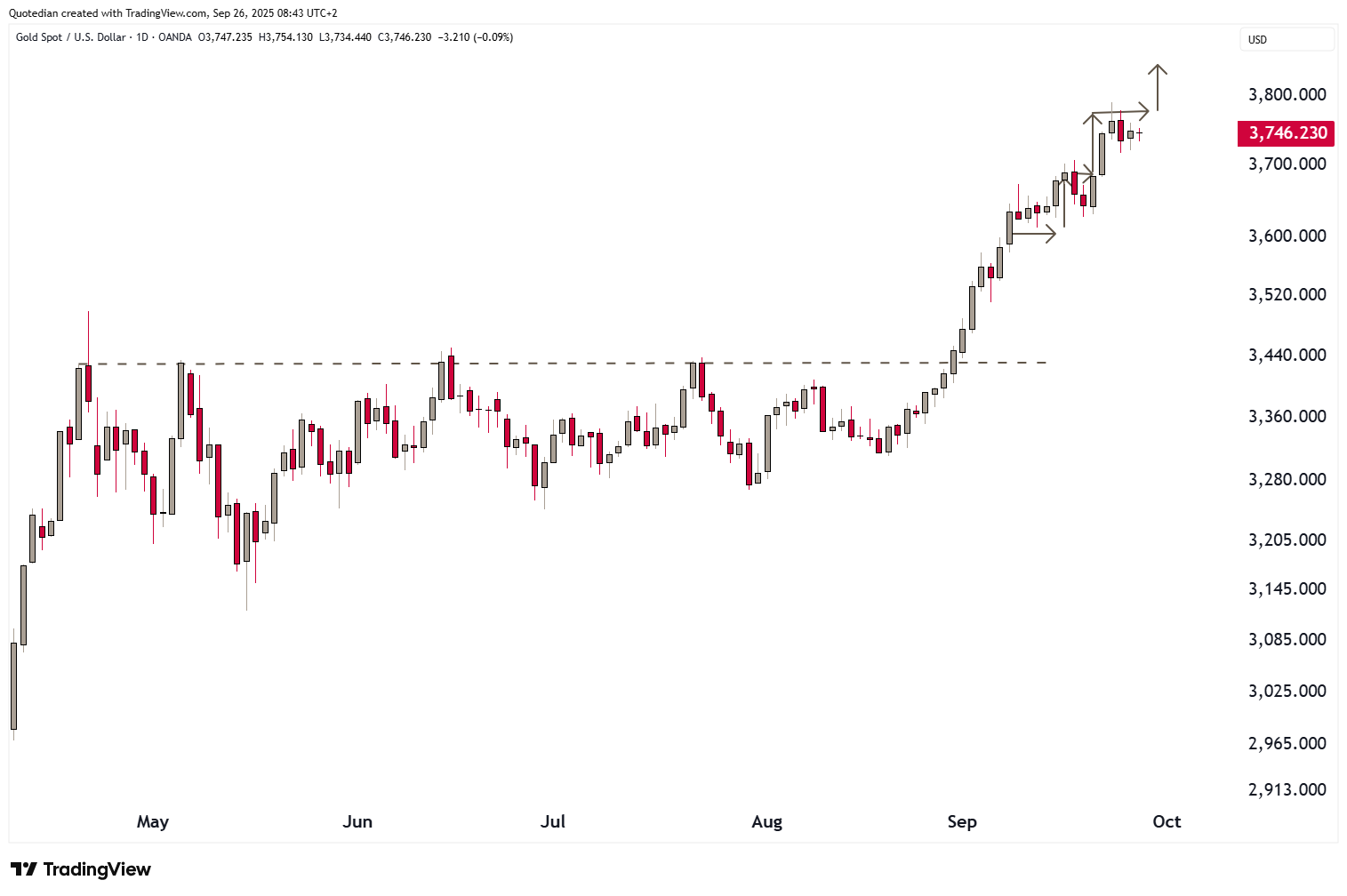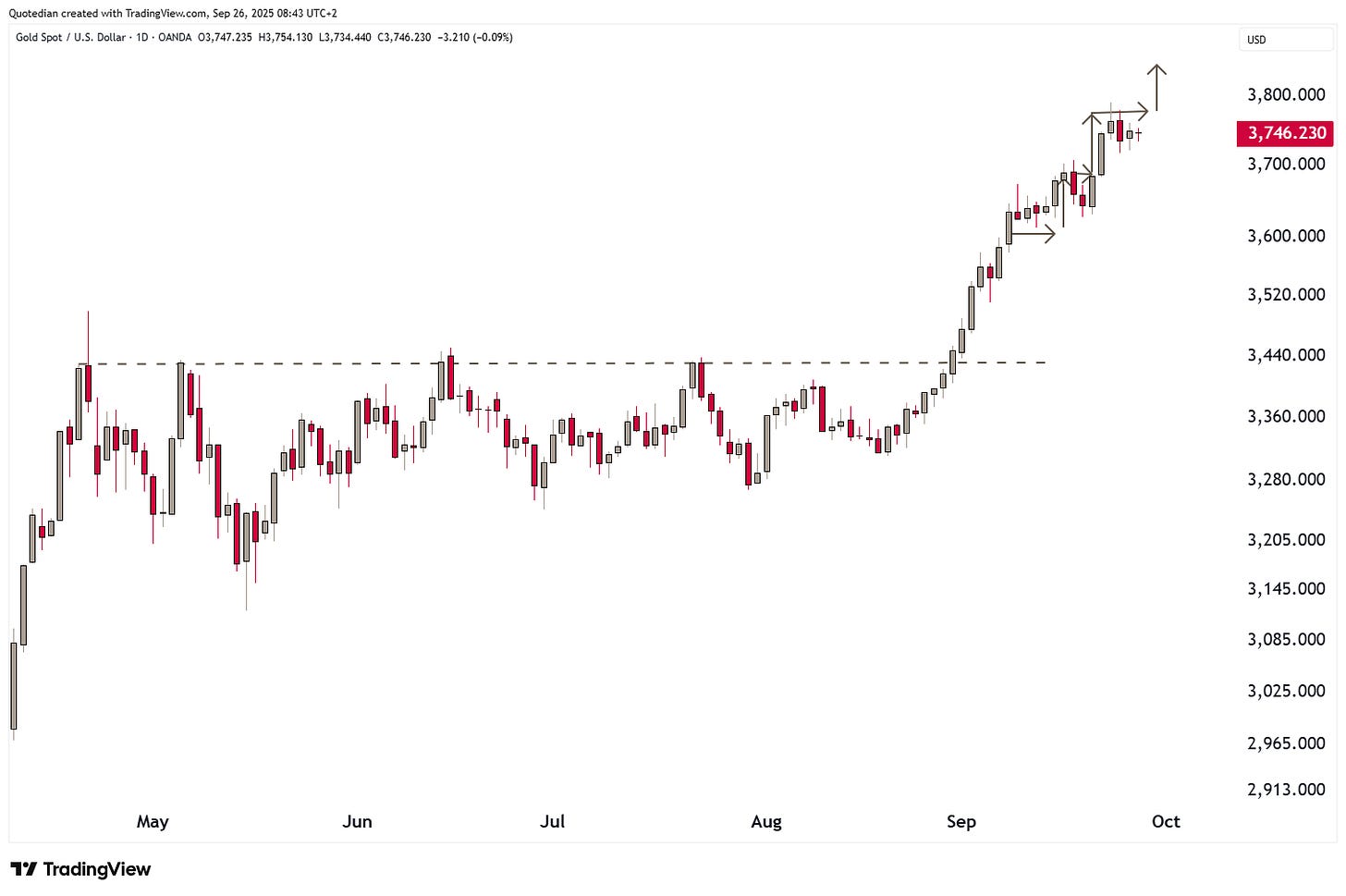 Completely unrelated 😉here’s the price of Gold, ready to break higher again: