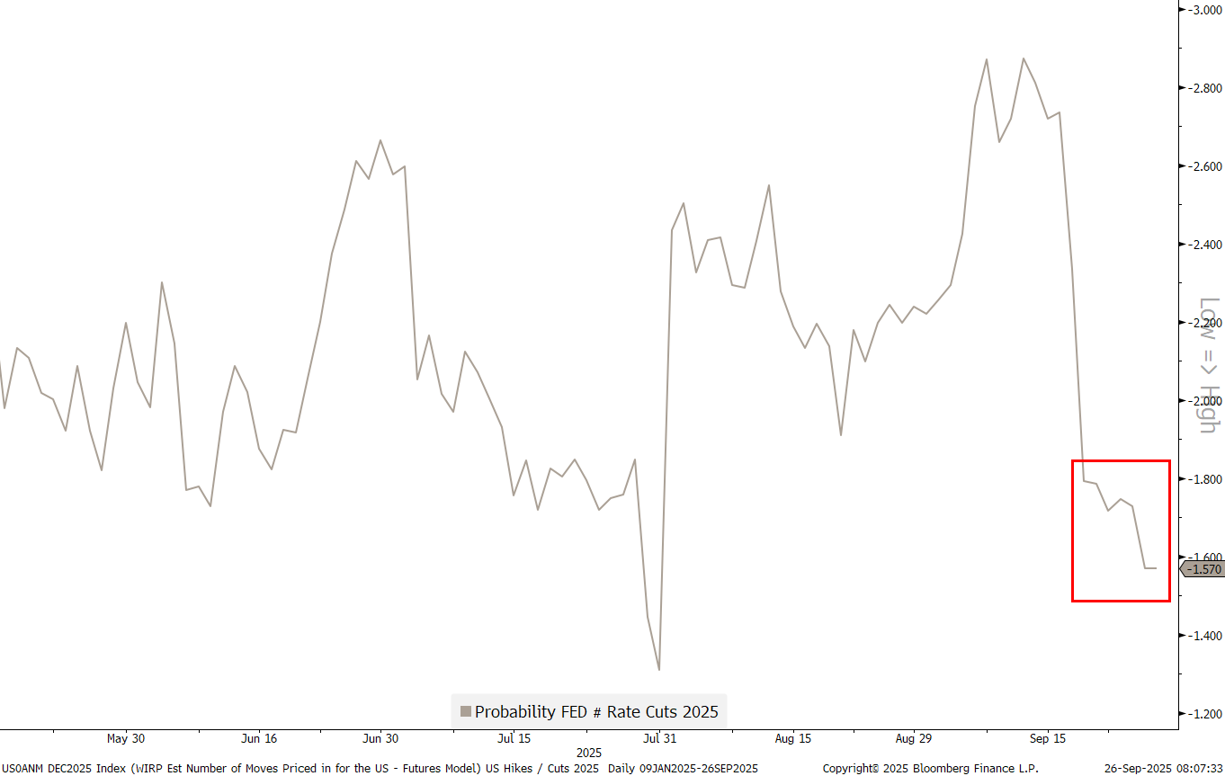 which in turn has led to a drop in the expectations for further FOMC rate cuts as derived from futures: