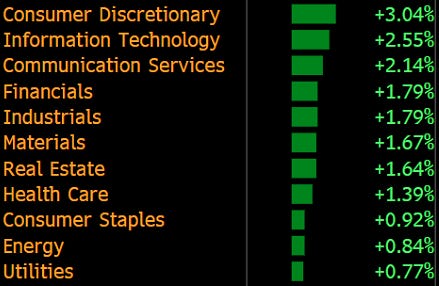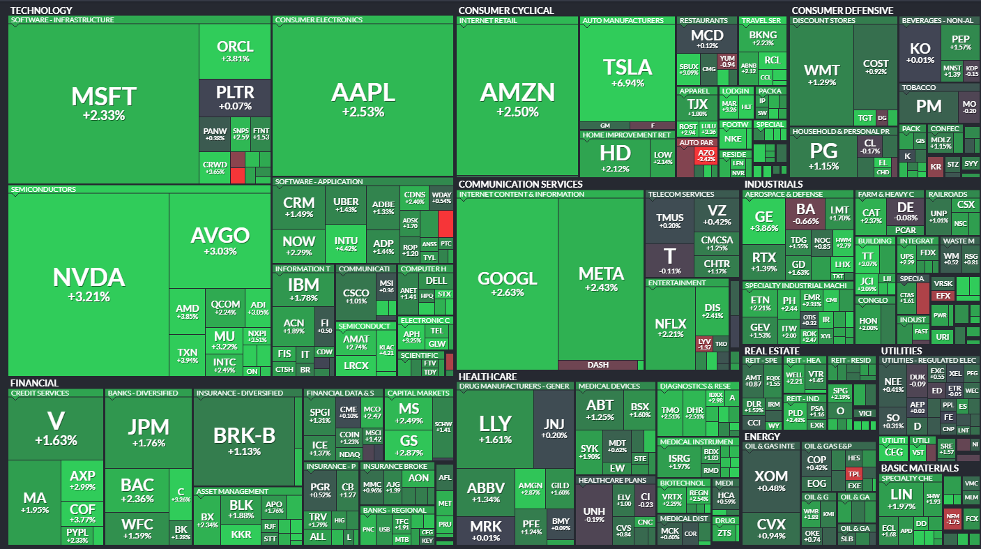 Not only were two of they most observed benchmark indices (S&P 500 and Nasdaq 100) up in excess of two percent, but participation in the rally was also very broad. Point in case, in the S&P 500 well over 90% (470) of the constituents ended the session higher leaving the market map seeming a sea of green:
