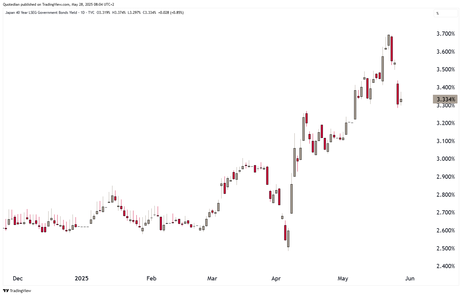 However, not only stocks were bid yesterday, but so was duration (bonds) too, on the back of the Ministry of Finance (MoF) in Japan implicitly suggesting reduction in issuance of long dated bonds. This pushed the yield on the 40-year JGB down 26 basis points from Monday’s close to the intraday session low yesterday: