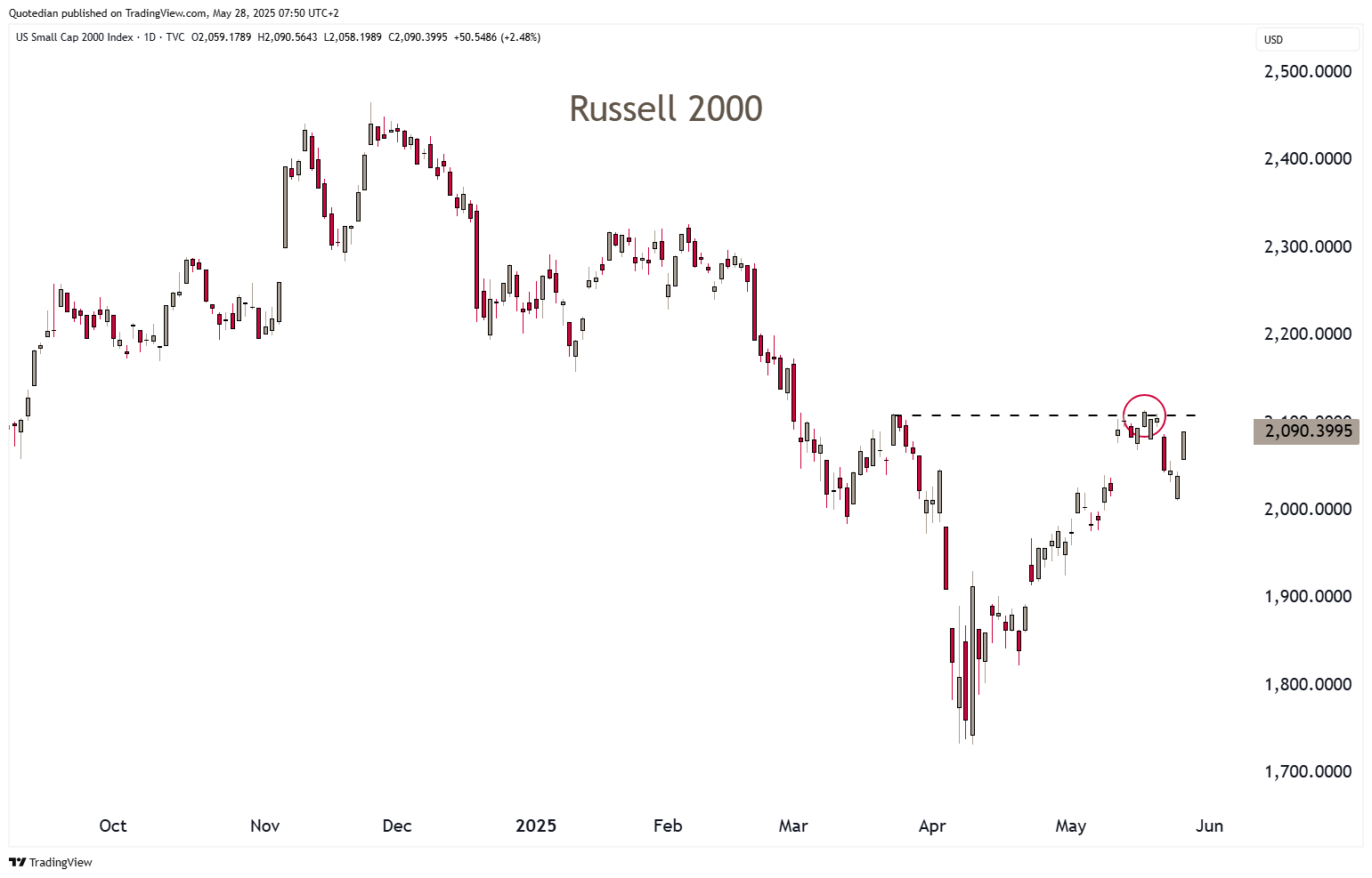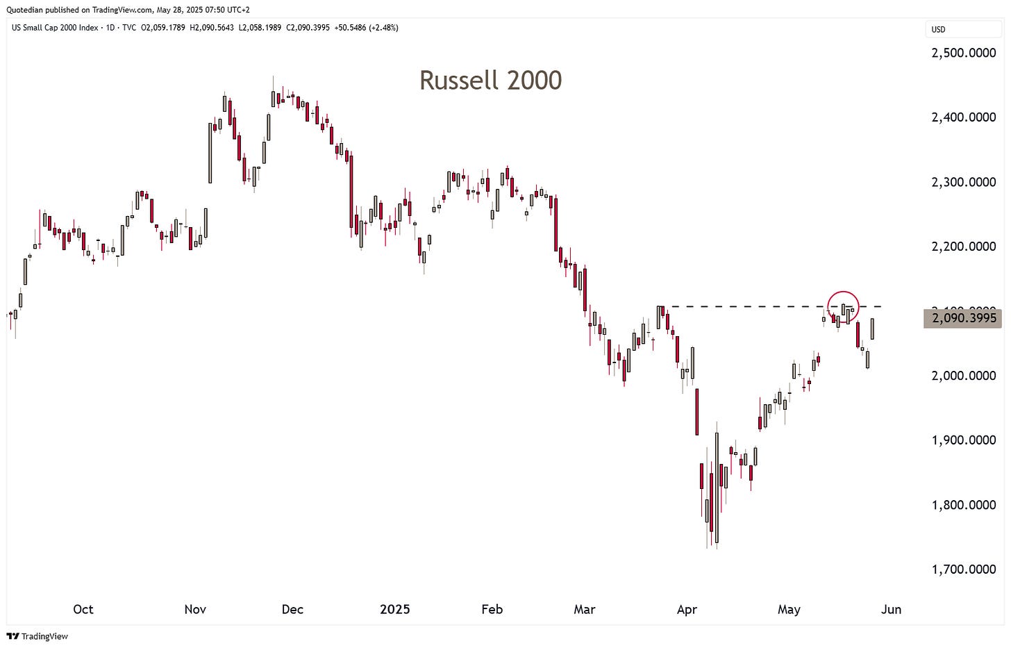 Even small cap stocks (Russell 2000) had their day in the sun and are quickly approaching major resistance (dashed line) again: