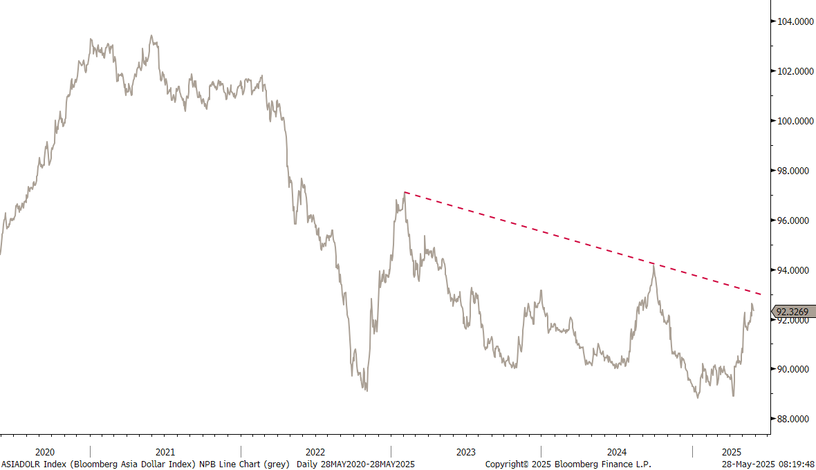 Looking at the Bloomberg Asia Dollar Index from a longer-term perspective then, we note that it is rapidly approaching what could be an important resistance point: