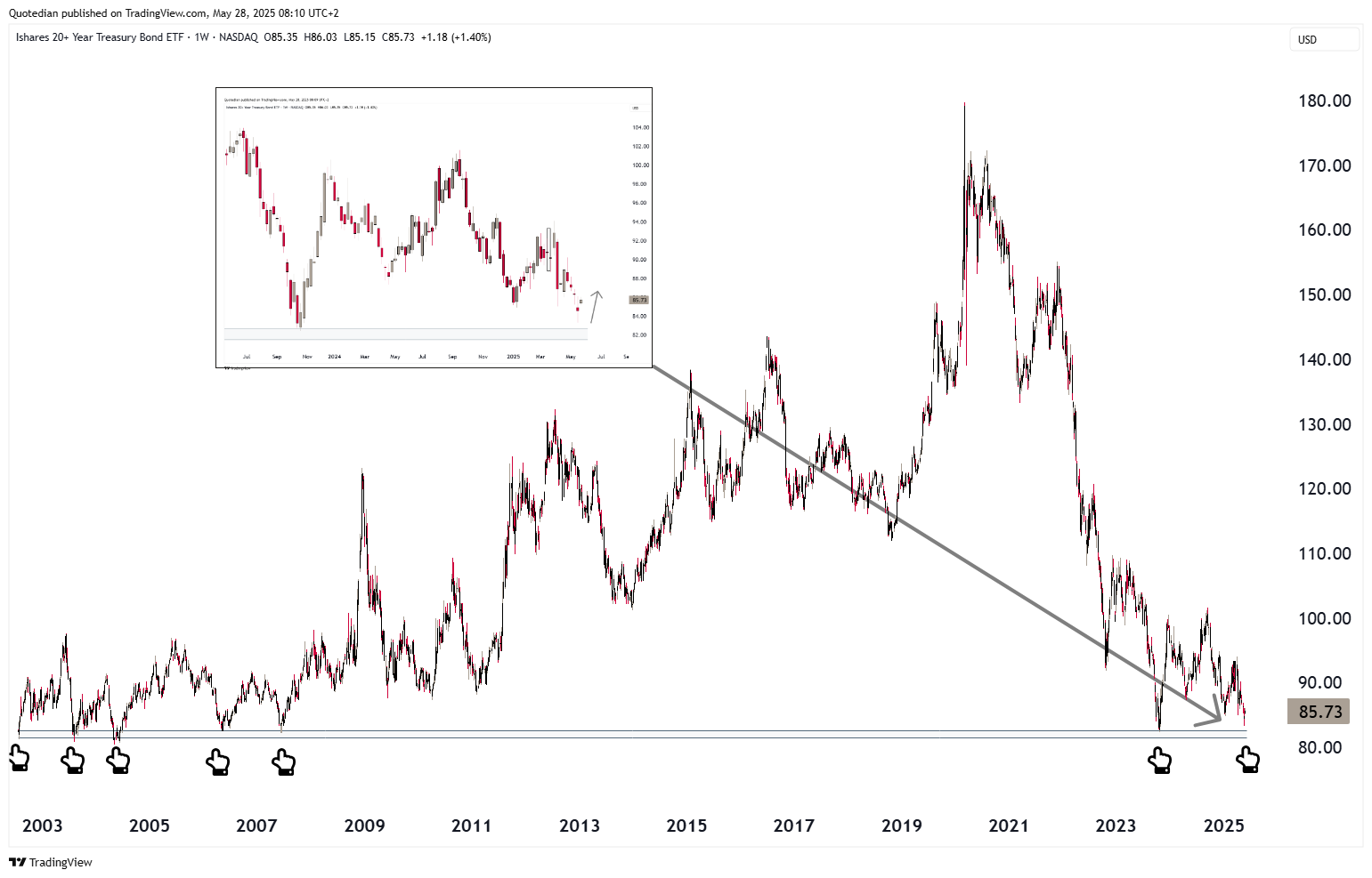 This led to a rally in global bonds (i.e. a yield sell-off), helping amongst others the TLT (iShares 20+ year Treasury Bond ETF) to recover from the support line we had discussed in this week’s Quotedian (click here):