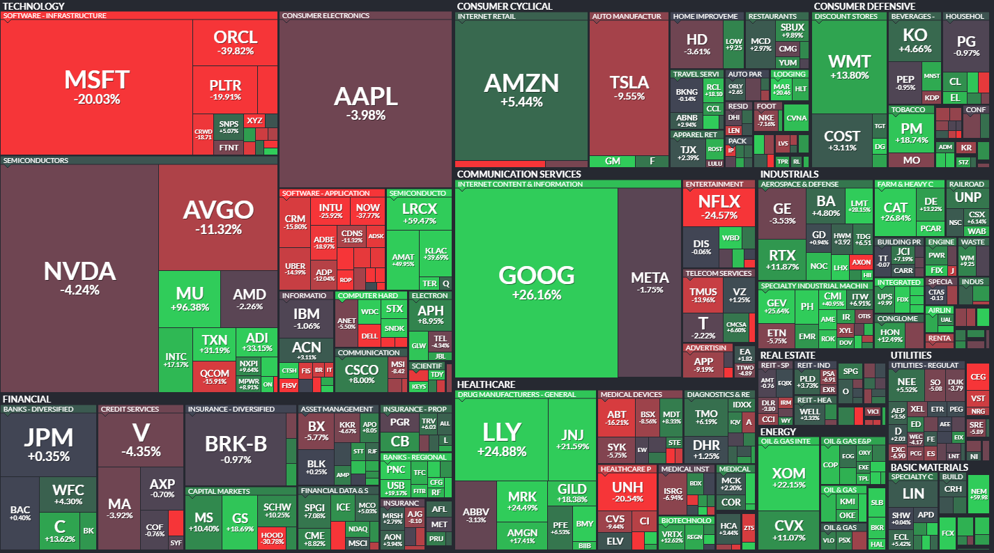 Culprits for the sub-par performance of the S&P 500 must be surely the Mag Seven, which, with the exception of Google, have shown a mediocre performance. Hereβs the S&P 500 heatmap for the past three months: