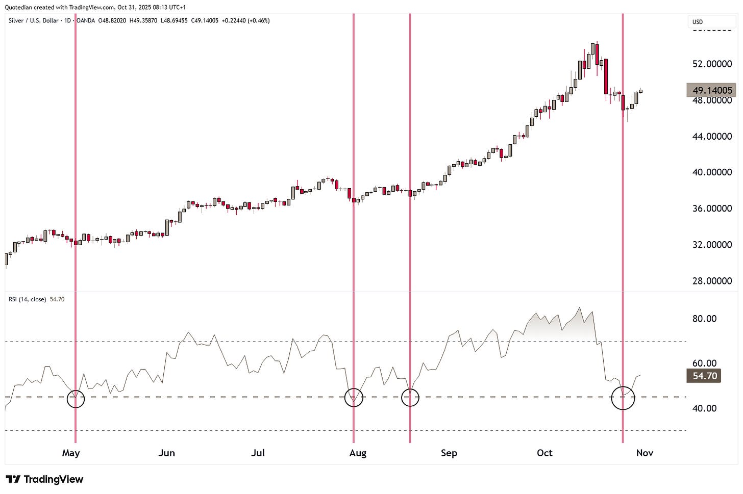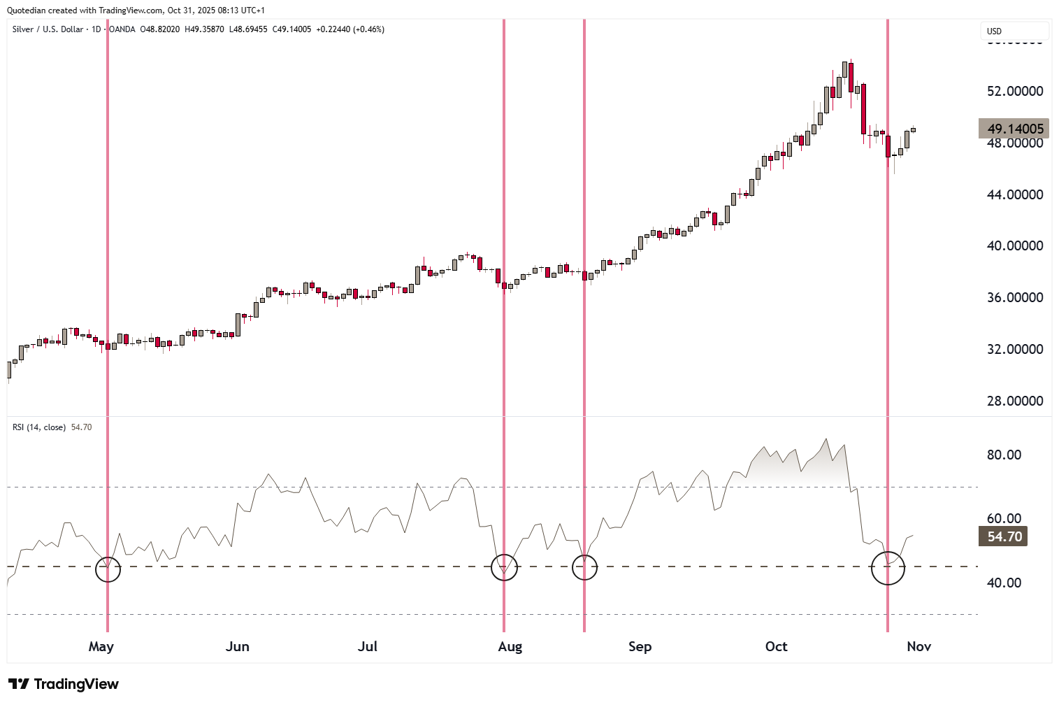 In commodity markets, Gold is trading above $4,000 again and Silver reclaimed the $49 level. The latter has seen its RSI turning higher again from a level which re-initiated short-term rallies in the past: