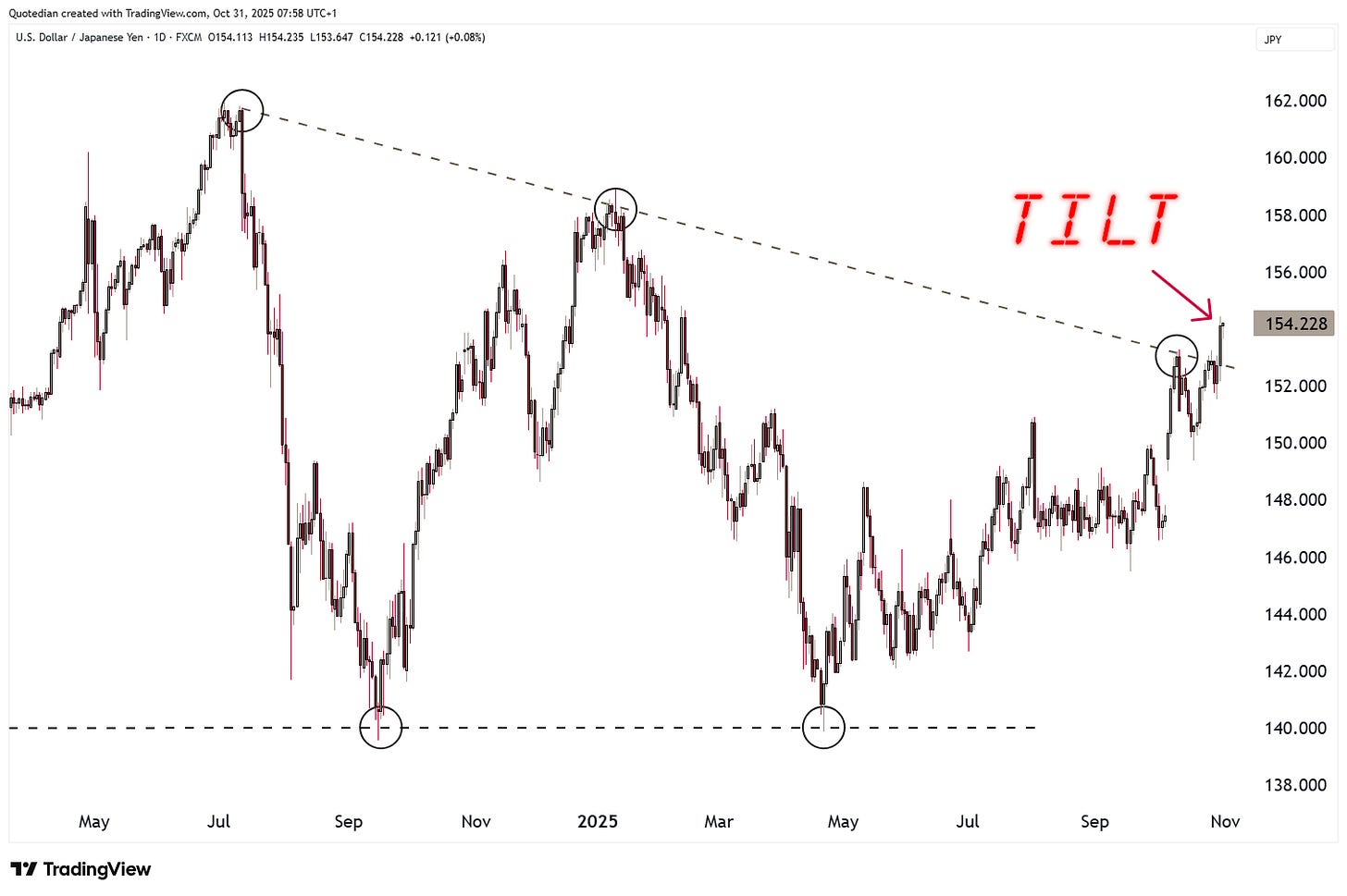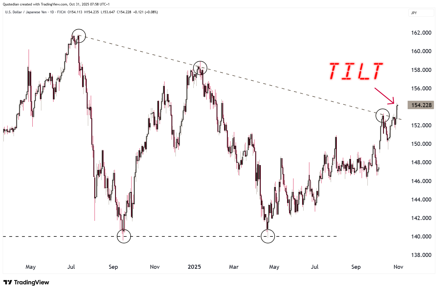 And here’s the chart of the USD/JPY, showing the Yen breaking down, i.e. the USD/JPY cross shooting above key resistance I had highlighted in the Quotedian (click here) earlier this week: