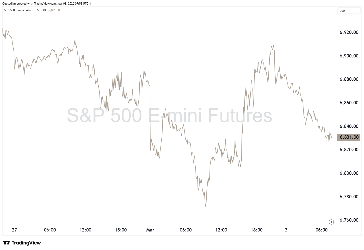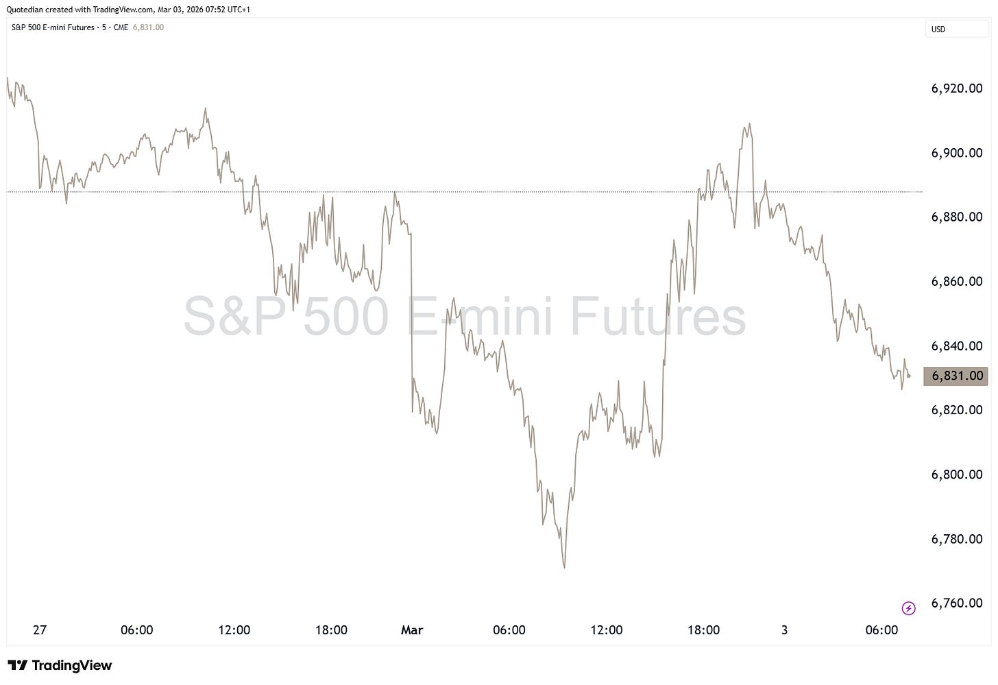 Is this maybe why equity markets have turned sour again overnight, after they had reclaimed early losses on Friday? Here’s the S&P mini-Future since Friday: