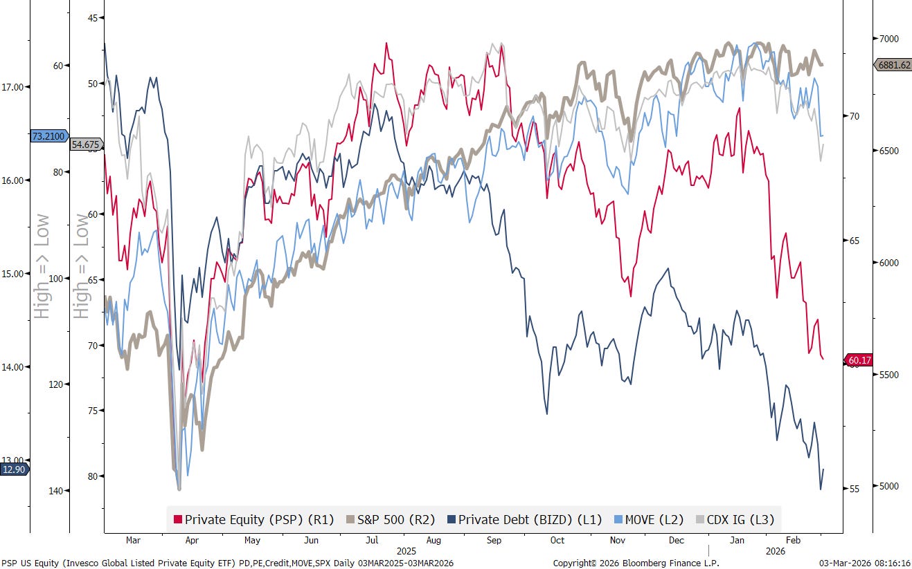 Seems everybody has already forgotten about the private credit disaster story that is unfolding and seems to be showing first sign of contagion into private equity and financial (bank) stocks.