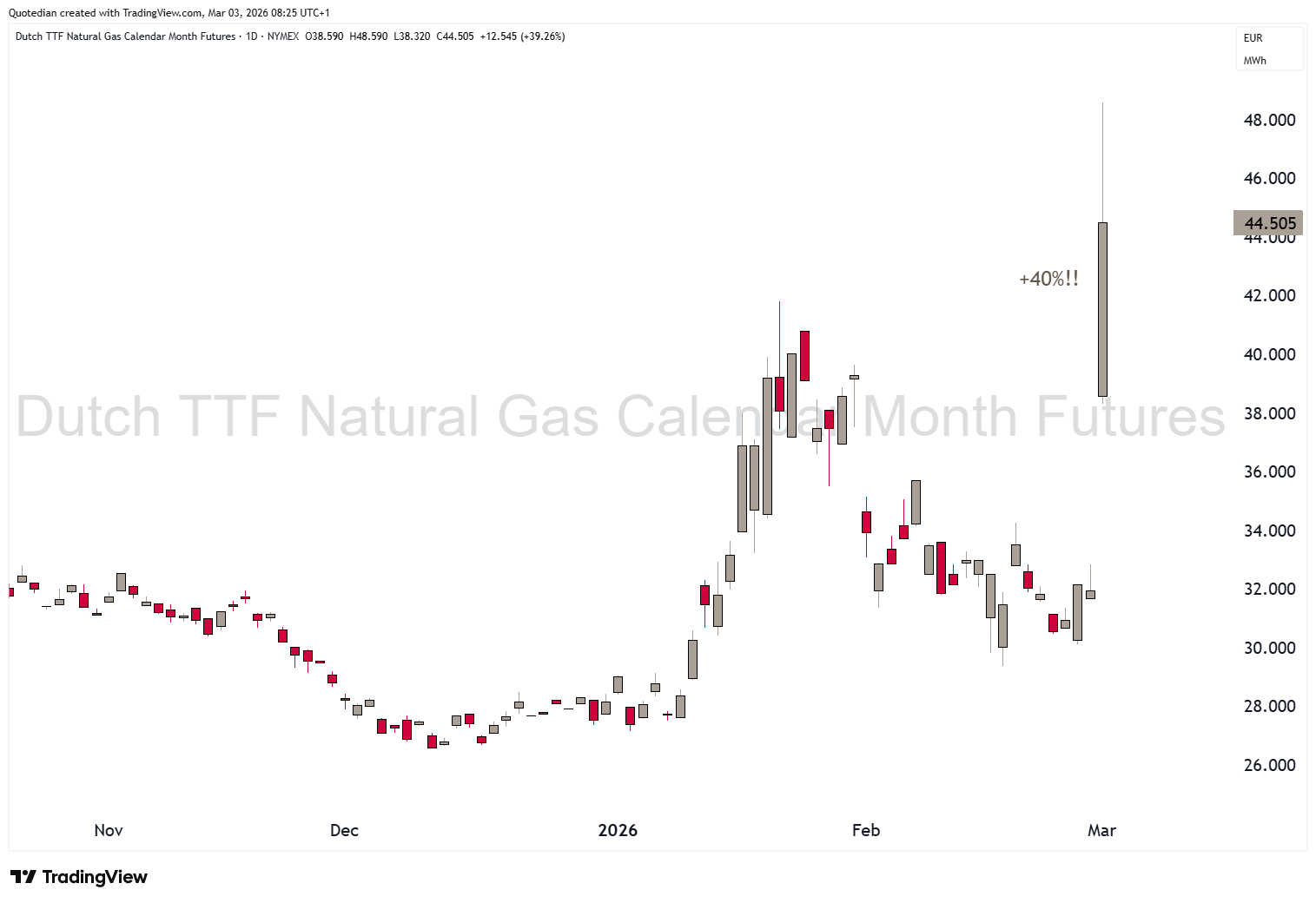 investors expect a massive increase in European energy costs (and defense is an-energy heavy industry). Here’s the price jump in Dutch Natural Gas prices: