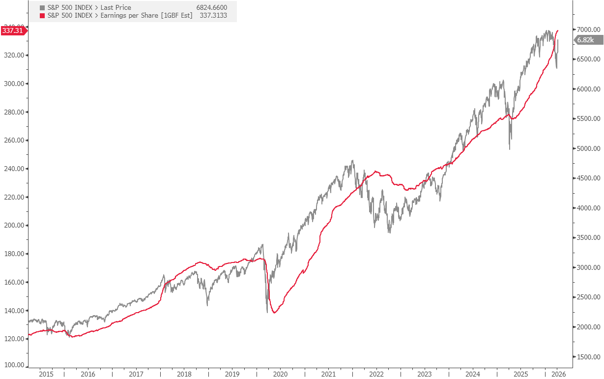 it will be important to see whether CFOs will downgrade their guidance. Analysts have not yet done so (next 12 month earnings estimates, red line),