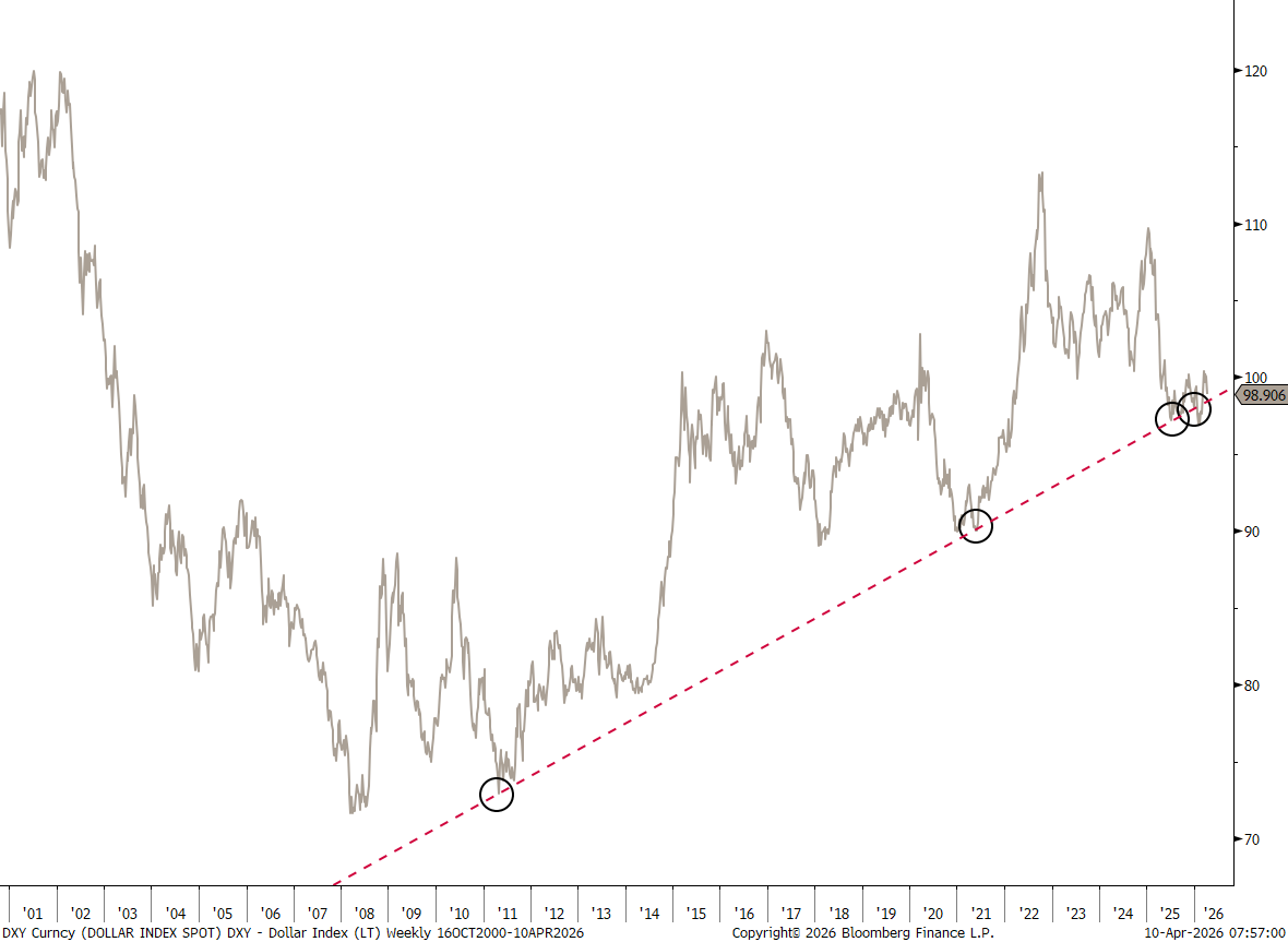 Rapidly back to the greenback though, where the lack of true strength during this major geopolitical crisis confirms our view that more secular weakness lies ahead. We are watching that red dashed line on the Dollar Index (DXY) chart very closely: