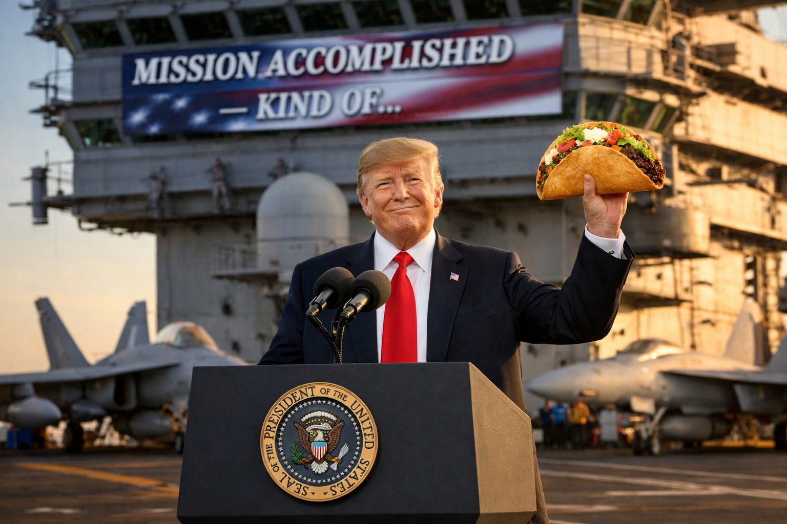 George W. Bush at least had the decency to land on an aircraft carrier in a flight suit before his “Mission Accomplished” moment in 2003. Trump did his from behind a podium at a golf club. With no flight suit. But hey — at least the banner would have been more honest: “Mission Accomplished — Kind Of...”