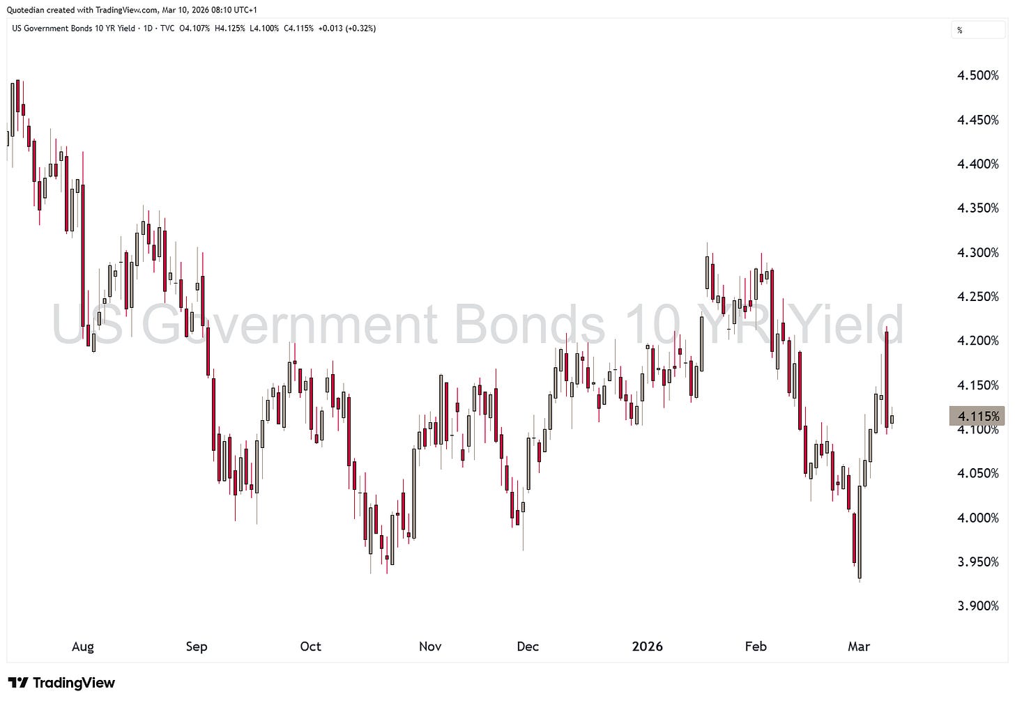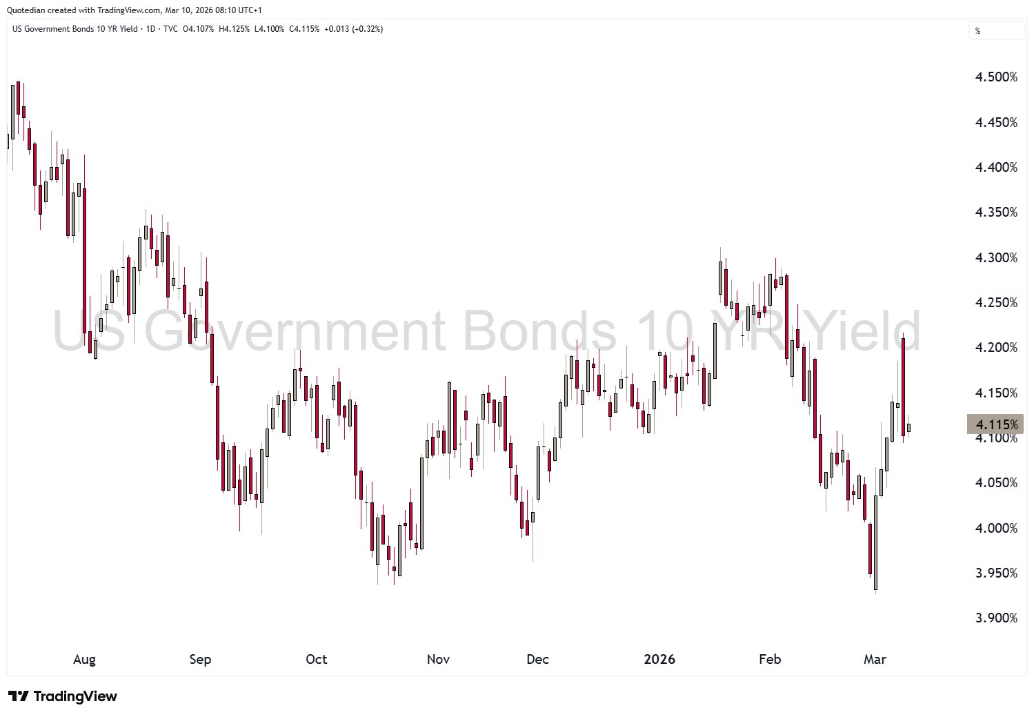 Bonds — 10Y at ~4.14%. Stagflation fear vs. flight to safety. Watch breakevens.