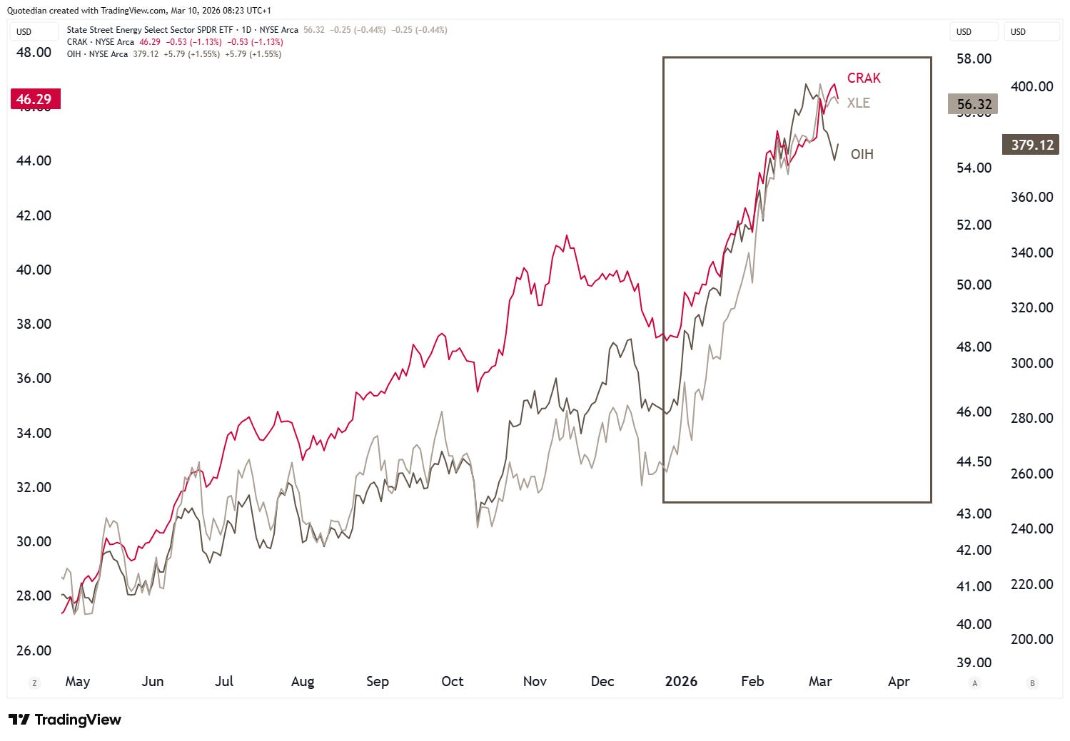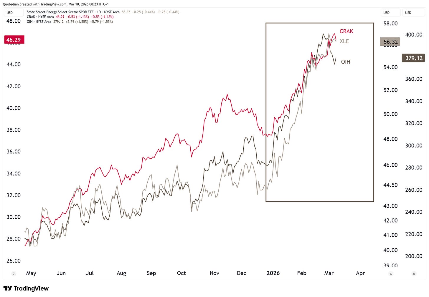 Don’t believe me? Just explain me then why oil stocks (below measured via several ETF proxies), have been going up weeks before the oil price did and months before the war broke out…