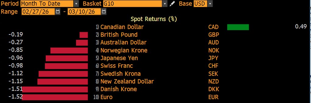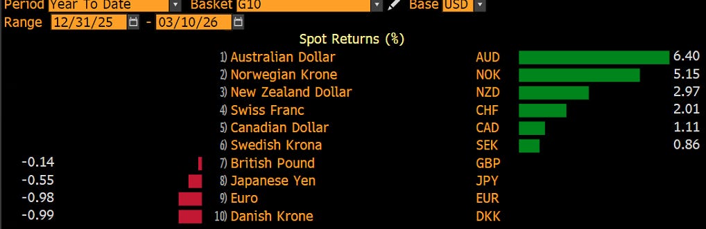 The US Dollar, a tad weaker since last night, continues to be the big winner since the outbreak of war: