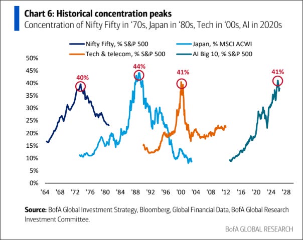 Good chart below from the fine folks at BofA. It compares the current concentration of the 10 largest AI-involved stocks to previous famous notorious concentration peaks.