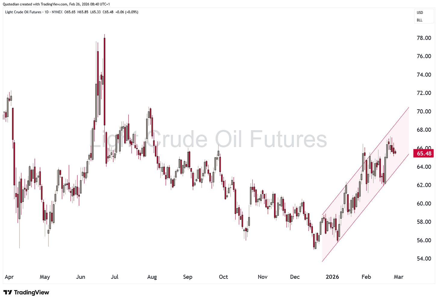 Well, it does continue to move within a defined uptrend (see chart above), but it is difficult to assess how much of a kinetic escalation is already in the price. Nevertheless, entering a long here with a tight stop somewhere below 65 would be a low-risk, high potential return proposition. Also, see our chart-of-the-day today.