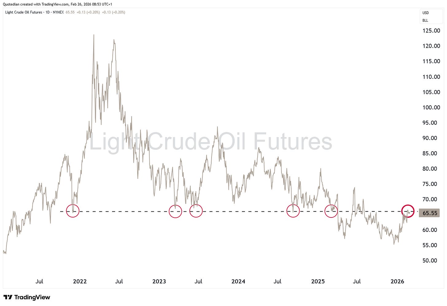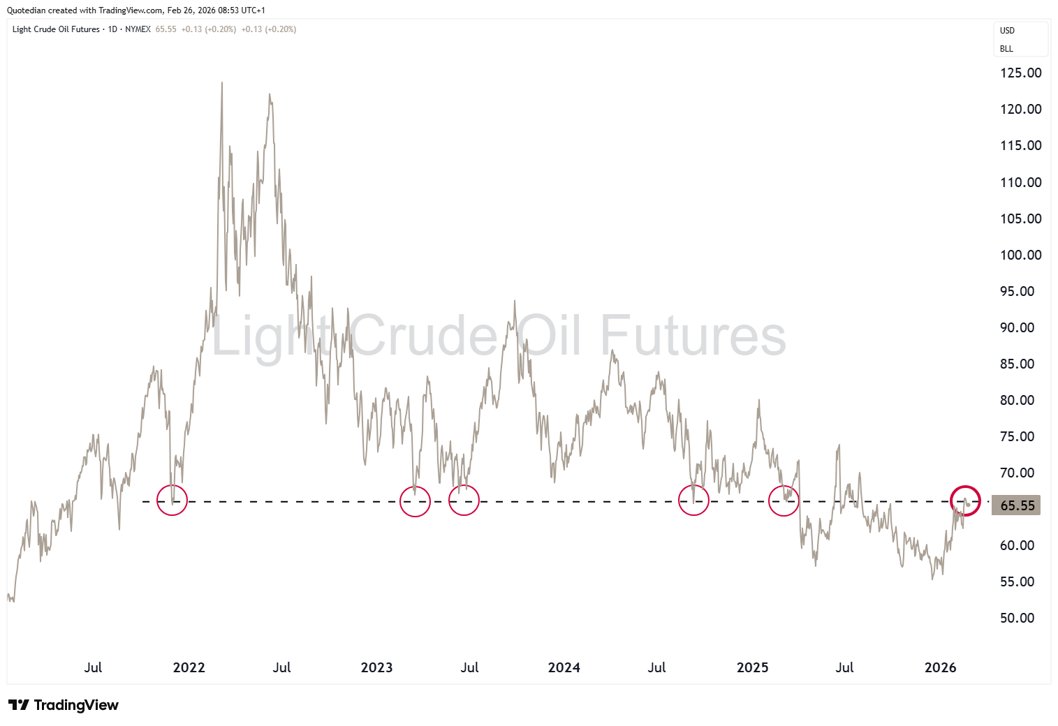We briefly discussd the oil price above and the its current positioning in an uptrend channel. Zooming out on the same (WTI), we note that the USD66 level, previously crucial support, has now turned into what could be an all-defining resistance level: