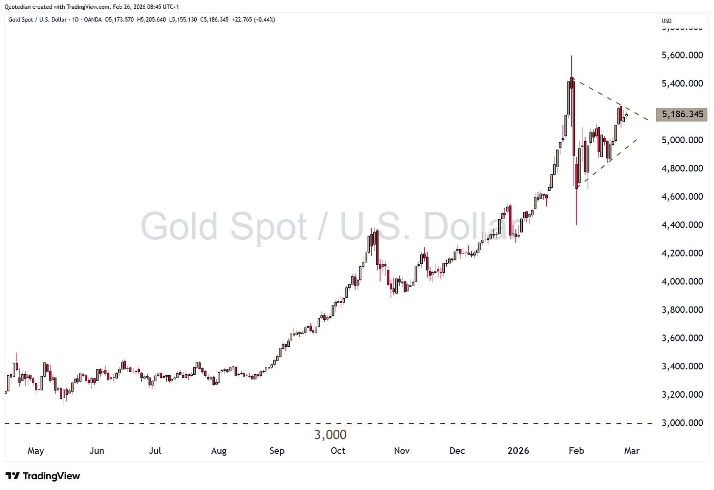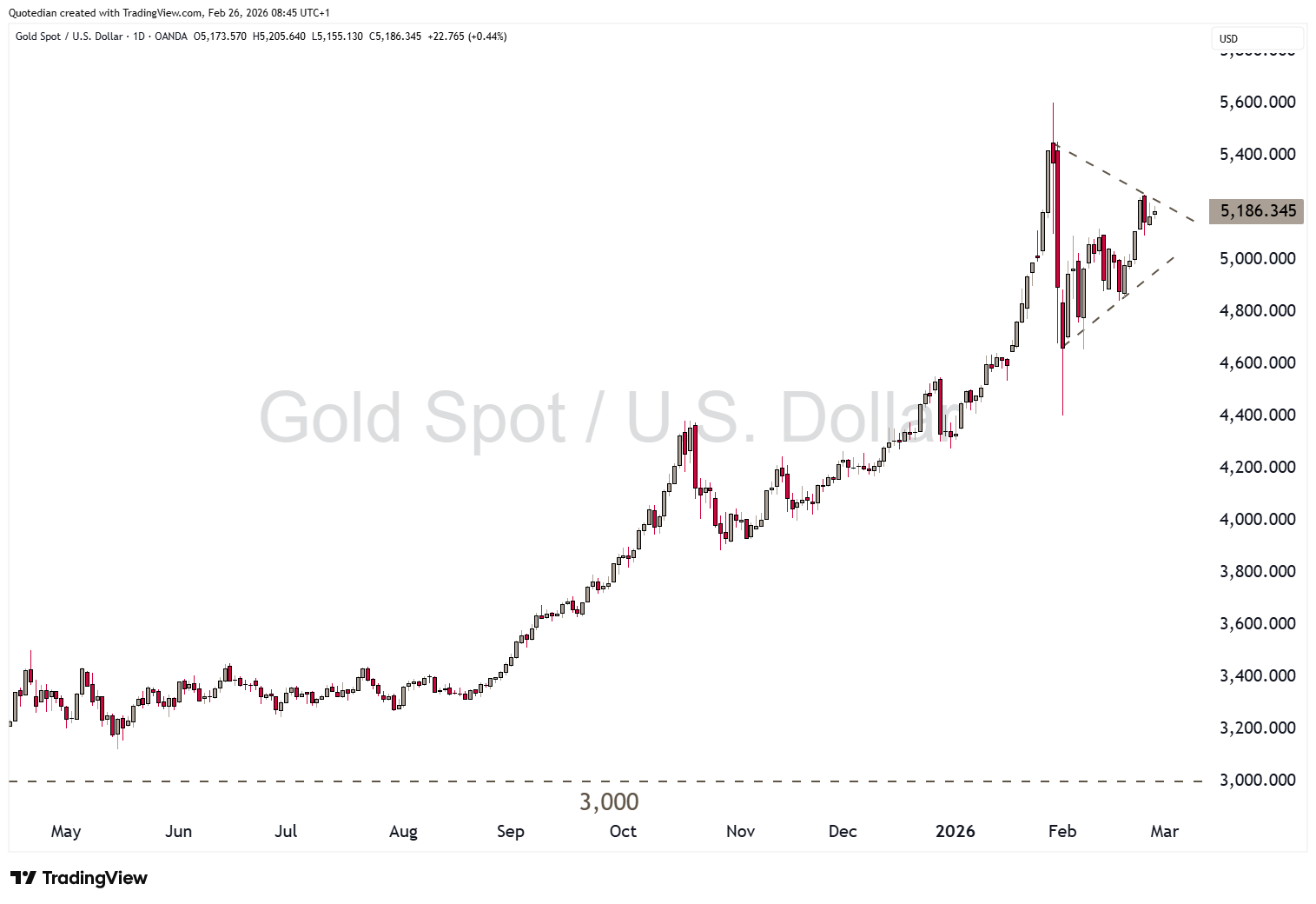 Perhaps, though pre-empting a breakout out of the triangle could be costly and a stop below 5,000 would surely be a good ‘hedge’ for an alternate outcome.